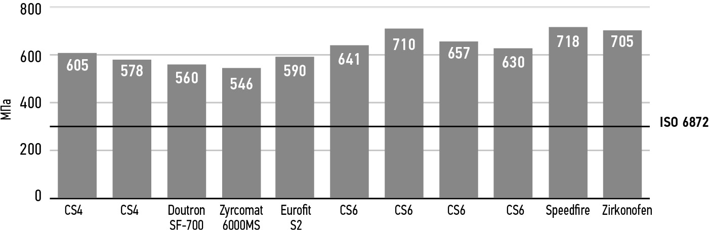 Все без исключения результаты механических испытаний превысили с большим запасом норматив международного стандарта 5798:2015 для одиночных керамических коронок в переднем и боковых отделах зубного ряда — 300 МПа. Превышен такой норматив для трехзвеньевых мостовидных протезов (не менее 500 МПа) этого же стандарта.