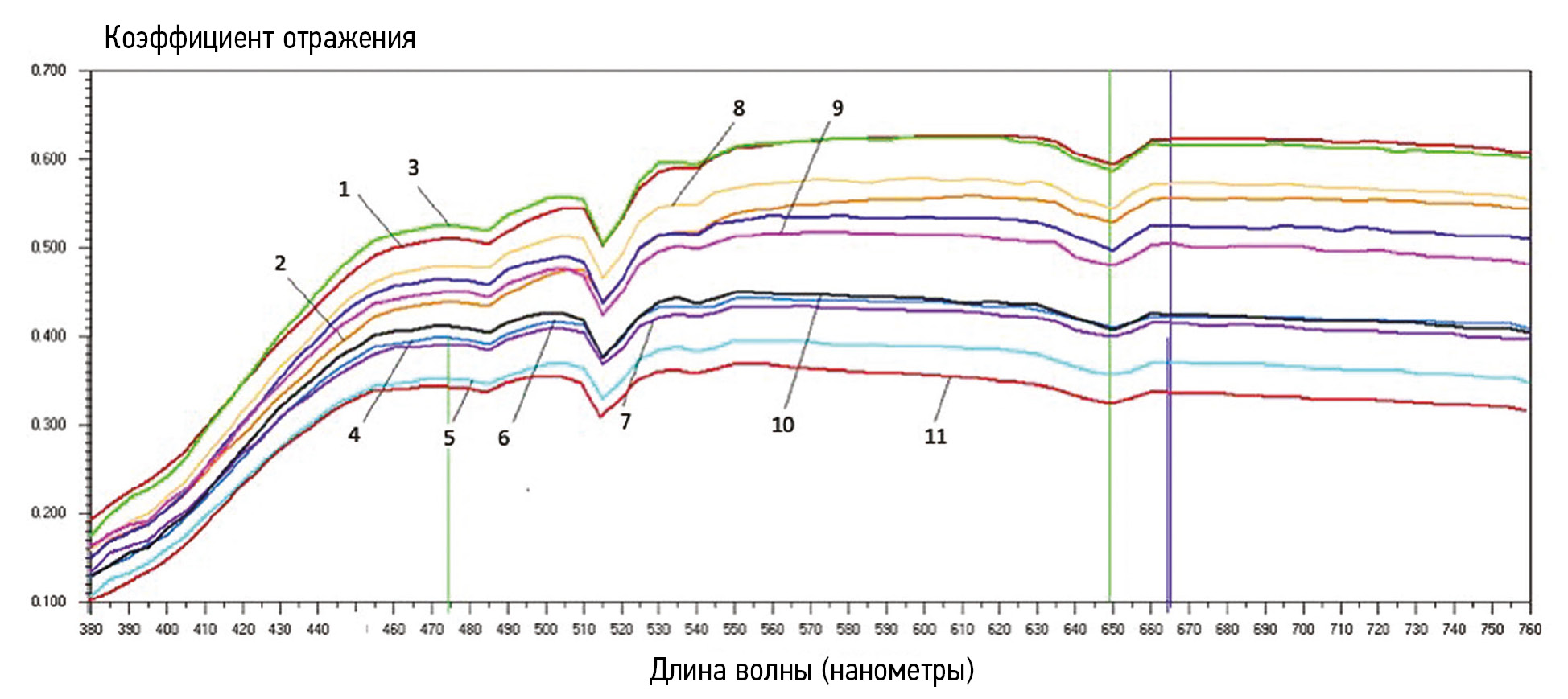 Рис. 2. Спектры 11 групп образцов керамики Ziceram T, цвет А2, после различных режимов экспресс-обжига