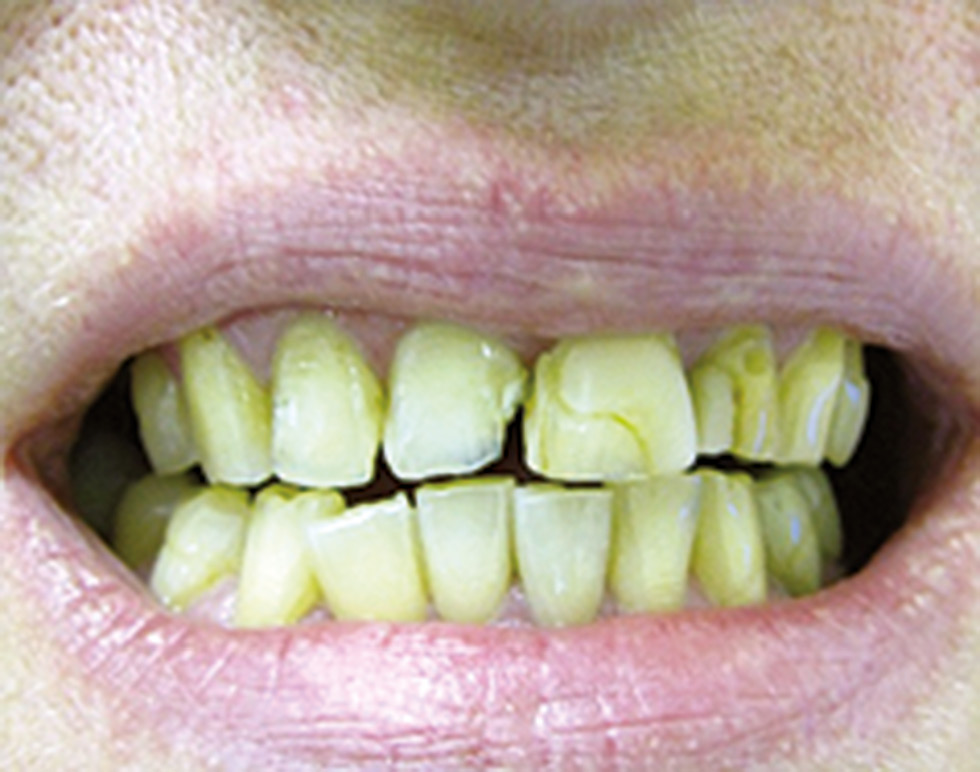 Рис. 2. Клинический случай восстановления дефекта твердых тканей 1.3; 1.2; 1.1; 2.1; 2.2; 2.3 керамическими коронками на каркасах из диоксида циркония. / Fig. 2. A clinical case of restoration of a defect of hard tissues 1.3; 1.2; 1.1; 2.1; 2.2; 2.3 ceramic crowns on frames made of zirconium dioxide.