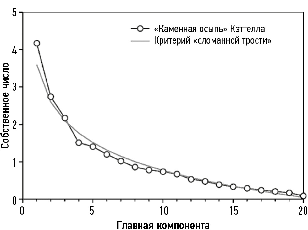 На рис. 1 критерии Кэттелла и «сломанной трости» указывают на необходимость и достаточность выделения 3 ГК, объясняющих в сумме 49,5% общей дисперсии данных.