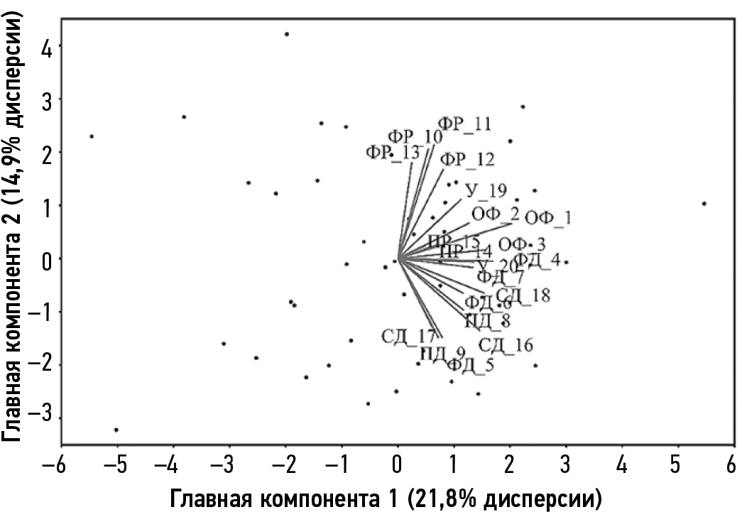 Первая, главная, компонента объясняла примерно 1/5 часть (21,8%) общей дисперсии данных. Из табл. 1 видно, что положительные нагрузки на нее были во всех без исключения вопросах, однако самые высокие связаны со сферами ОФ, ФД, СД и У.