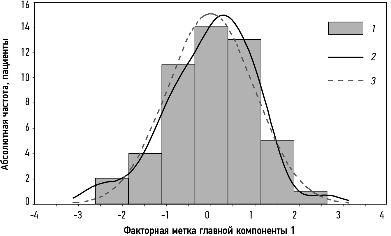 Рис. 3. Распределение пациентов по значениям первой главной компоненты качества жизни: 1 — гистограмма, 2 — плотность распределения, 3 — нормальная кривая / Fig. 3. Distribution of patients according to the values of the first main component of quality of life: 1 — histogram, 2 — kernel density, 3 — normal curve