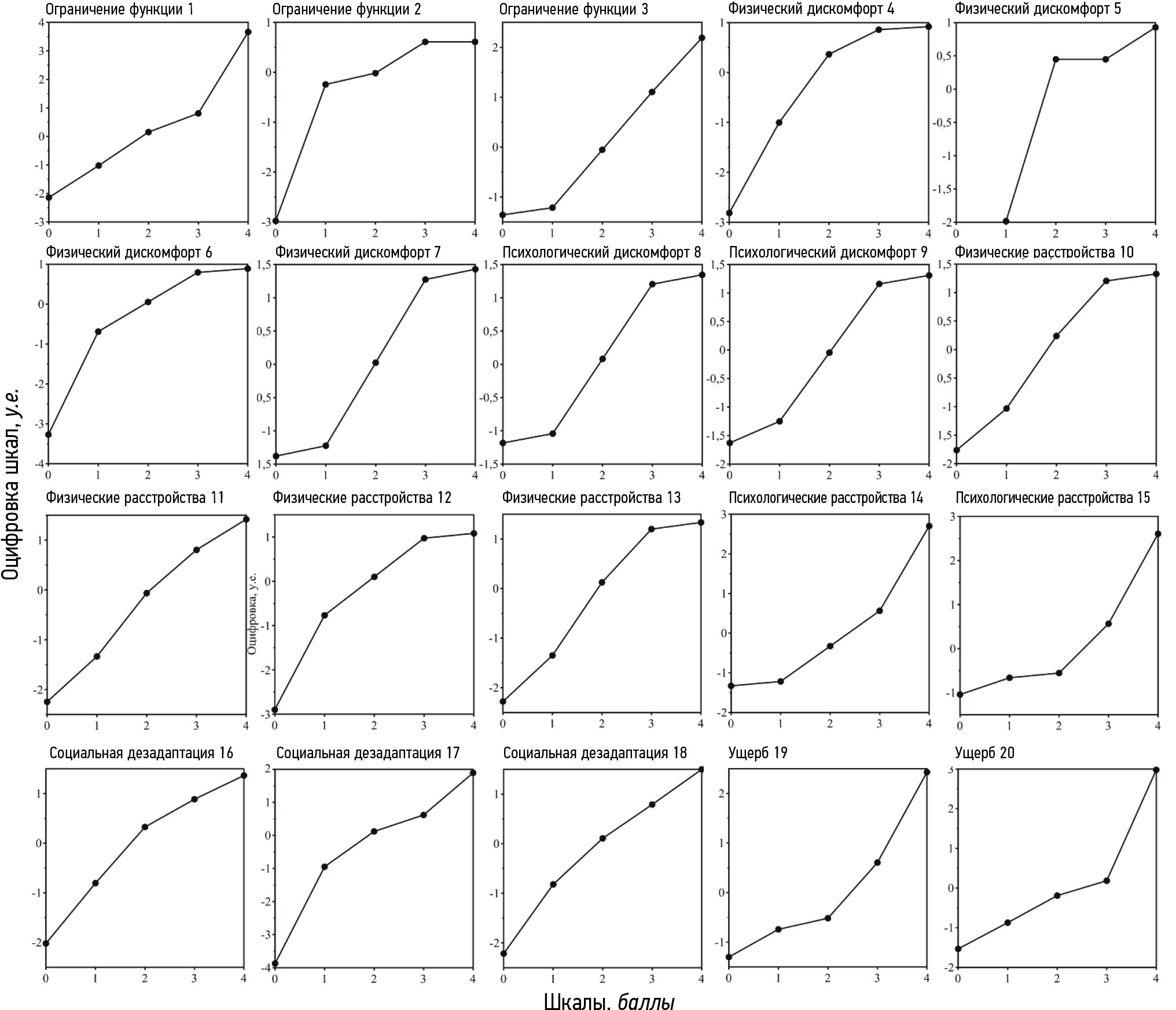 Из табл. 2 видно, что в большинстве случаев ломаные линии заметно отклонялись от прямой, что указывает на вероятную нелинейность восприятия сфер качества жизни пациентами. Так, например, первым фрагментом рис. 4 является график оцифровки шкалы 1-го вопроса опросника, относящегося к сфере ограничения функции «Как часто Вы испытываете трудности при приеме пищи в связи с проблемами, связанными с зубами, слизистой оболочки рта или протезами». Если принять, что оцифрованная шкала отражает внутреннее восприятие пациентами ответа на вопрос, то видно, что восприятие указанных трудностей респонденты оценивают примерно линейно в диапазоне от «постоянно» (0 баллов) до «крайне редко» (3 балла), тогда как ответ «никогда» (4 балла) имеет заметно больший вес в оценке. Более того, расстояние в восприятии трудностей между «постоянно» (оцифрованное значение равно –2,14 условных единиц) до «крайне редко» (0,81) составляет 2,14+0,81=2,95, что практически равно расстоянию между «крайне редко» (0,81) до «никогда» (3,66), т. е. 3,66–0,81=2,85.