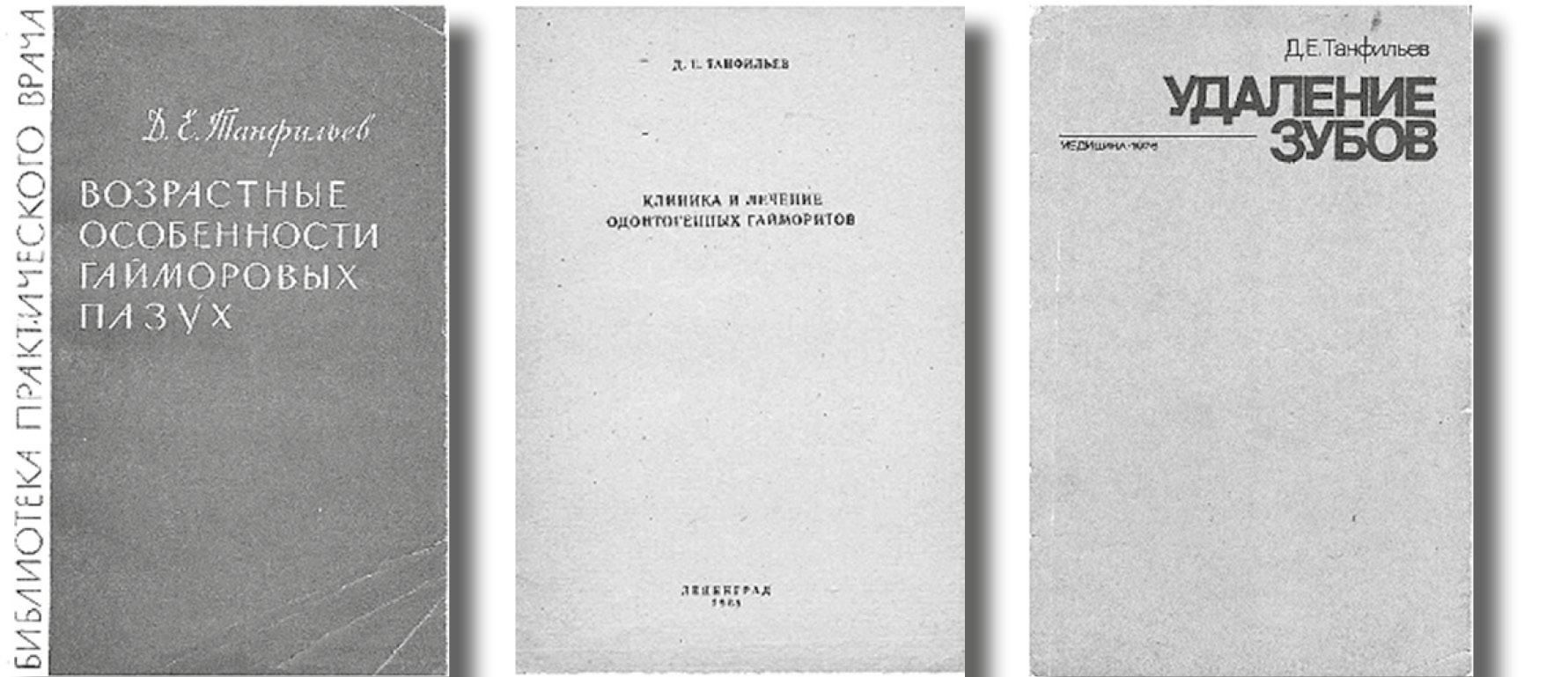Особое внимание Д.Е. Танфильев уделял клинической картине и лечению сочетанных огнестрельных повреждений верхней челюсти. Результаты этих исследований были опубликованы в учебном пособии «Клиника и лечение одонтогенных гайморитов» [6], а также в виде монографии «Возрастные особенности верхнечелюстных пазух [7]. Последняя, несмотря на более полувековое свое существование, до сих пор является востребованной среди врачей-стоматологов, челюстно-лицевых хирургов и оториноларингологов, содержит наиболее полные сведения по возрастным особенностям строения верхнечелюстных пазух. Особенно интересно в монографии представлены вопросы терапии заболеваний верхнечелюстных пазух в связи с возрастными изменениями и типами костной структуры, а также проблемы зубного протезирования в зависимости от возрастной функциональной перестройки верхней челюсти, что имеет большое прикладное значение.