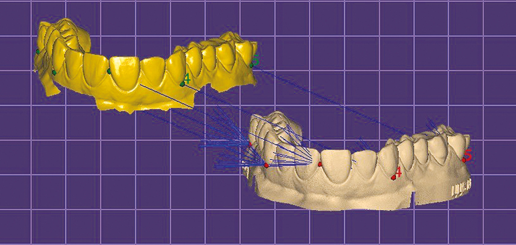 Два STL-файла сопоставлялись путем поочередного расположения 5 точек на моделях: в середине цервикальной линии вторых моляров справа и слева, по центру цервикальной линии клыков с правой и левой стороны, а также у режущего края центральных резцов у медиальных апроксимальных контактов (рис. 4).