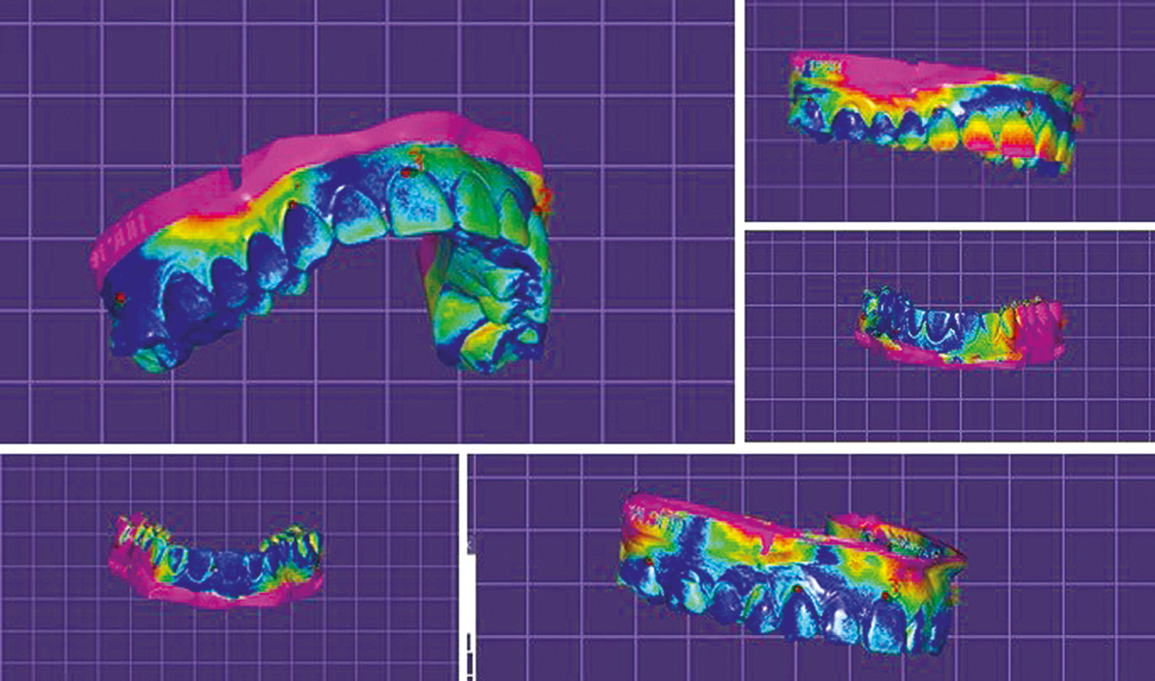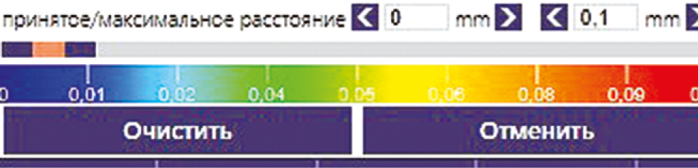 После сопоставления двух объемных изображений программа окрашивала модели в различные цвета, соответствующие величине расхождения: 10 мкм — в синий цвет, 11–22 мкм — голубой, 23–52 — зеленый, 53–62 — желтый, 63–80 — оранжевый. Далее расхождение до 100 мкм отображается красным цветом, при большем расстоянии область становится розового цвета (рис. 6).