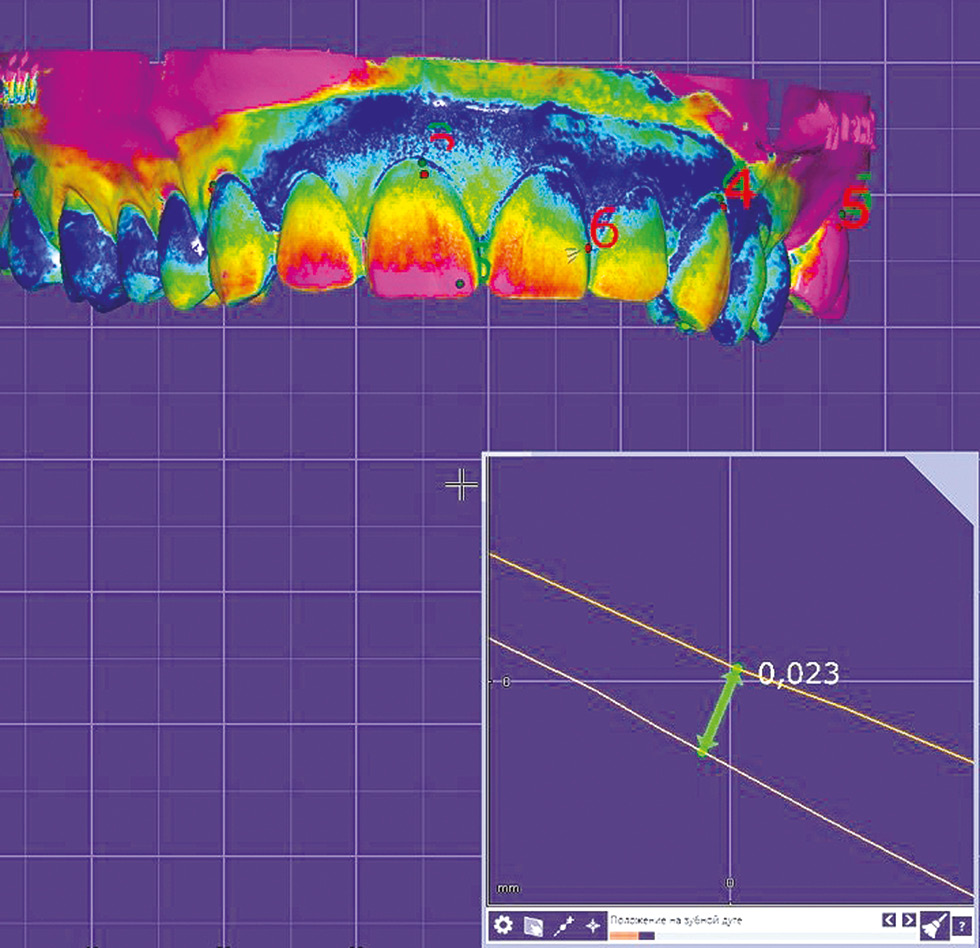В каждом случае производился расчет отклонений между каждой точкой на мастер-модели и моделью, отсканированной интраоральным сканером (рис. 5).