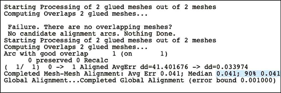 Помимо измерений в референсных точках, осуществили совмещение полученных объемных изображений в программе MeshLab. Алгоритм работы программы состоит в рандомизированном выборе большого количества точек на объемных изображениях, равного числу вершин одного из объемных изображений. Для каждой точки одной модели вычисляются точки другого цифрового оттиска для нахождения наиболее близкой, которая отмечается и запоминается программой. Среди всех запомненных расстояний автоматически высчитывается медиана расстояний. Данная величина позволяет оценить объемную точность трехмерных моделей, при этом она не характеризует прецизионность и величину погрешности сканирования в различных участках модели [20].