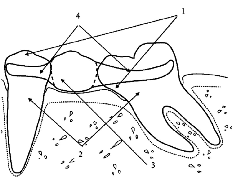 Fig. 1. Construction of a temporary removable prosthesis of small length: 1 — the patient’s dentition; 2 — teeth limiting the defect of the dentition; 3 — a temporary removable prosthesis; 4 — retention elements of a temporary removable denture