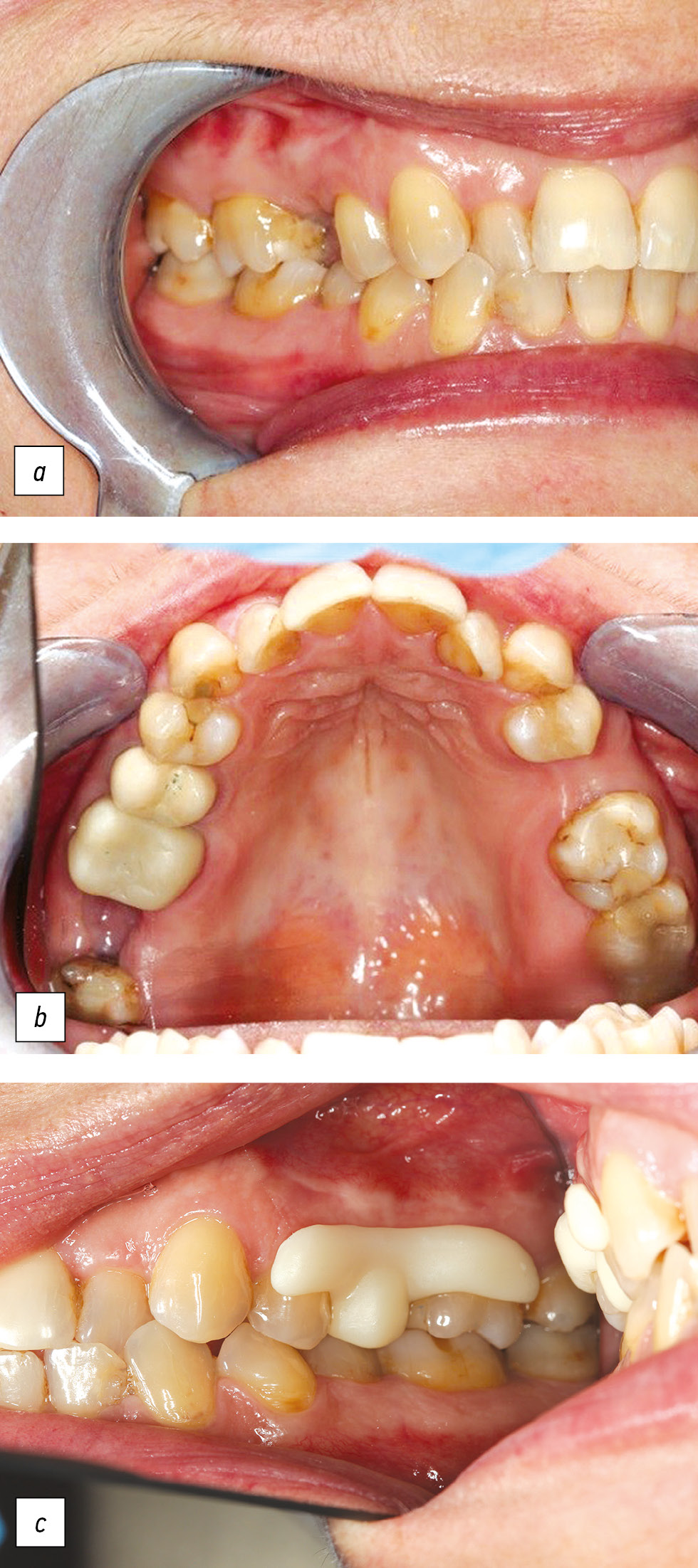 а, b — ортогнатический прикус; фиссурно-бугорковые взаимоотношения с антагонистами нарушены; зубы, ограничивающие дефект зубного ряда, имеют горизонтальное смещение в сторону отсутствующего зуба 2.5; с — временный съемный протез малой протяженности для лечения горизонтального смещения зубов