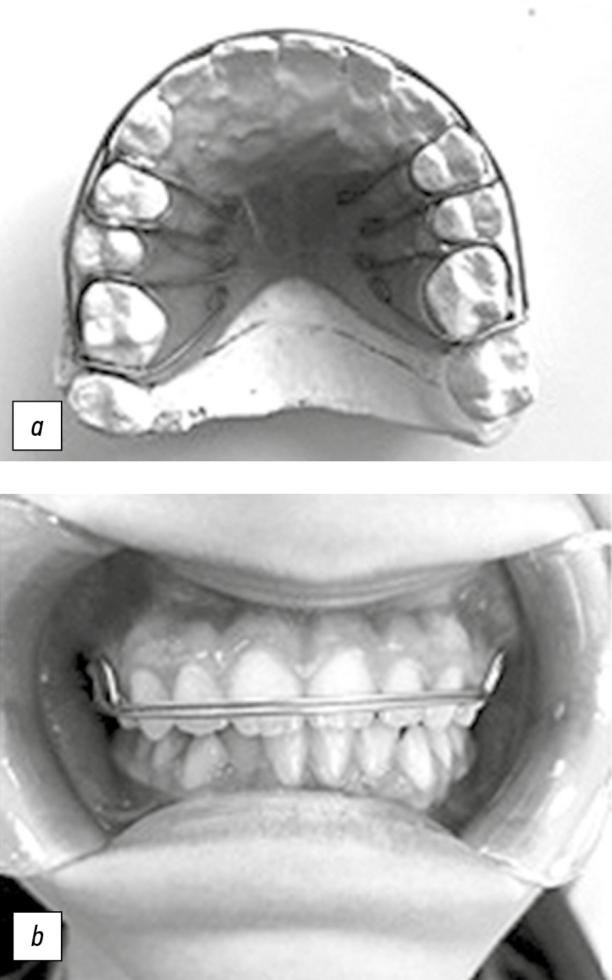 Рис. 2. Съемный ретейнер собственной конструкции (a) в полости рта (b).