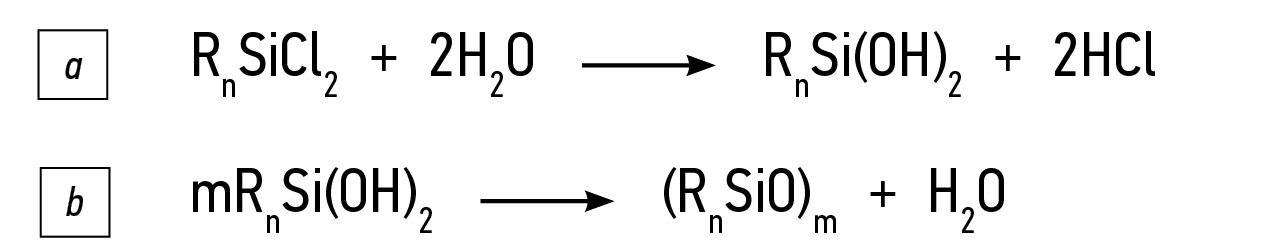 Рис. 1. Получение полисилоксана на примере дихлорсилана: а) реакция получения диорганосиланола из дихлорсилана; b) олигомеризация неустойчивого диорганосиланола с образованием полисилоксана. / Fig. 1. Obtaining polysiloxane as an example of a dichlorosilane: a) reaction of diorganosilanol from dichlorosilane; b) oligomerization of unstable diorganosilanol with the formation of polysiloxane.