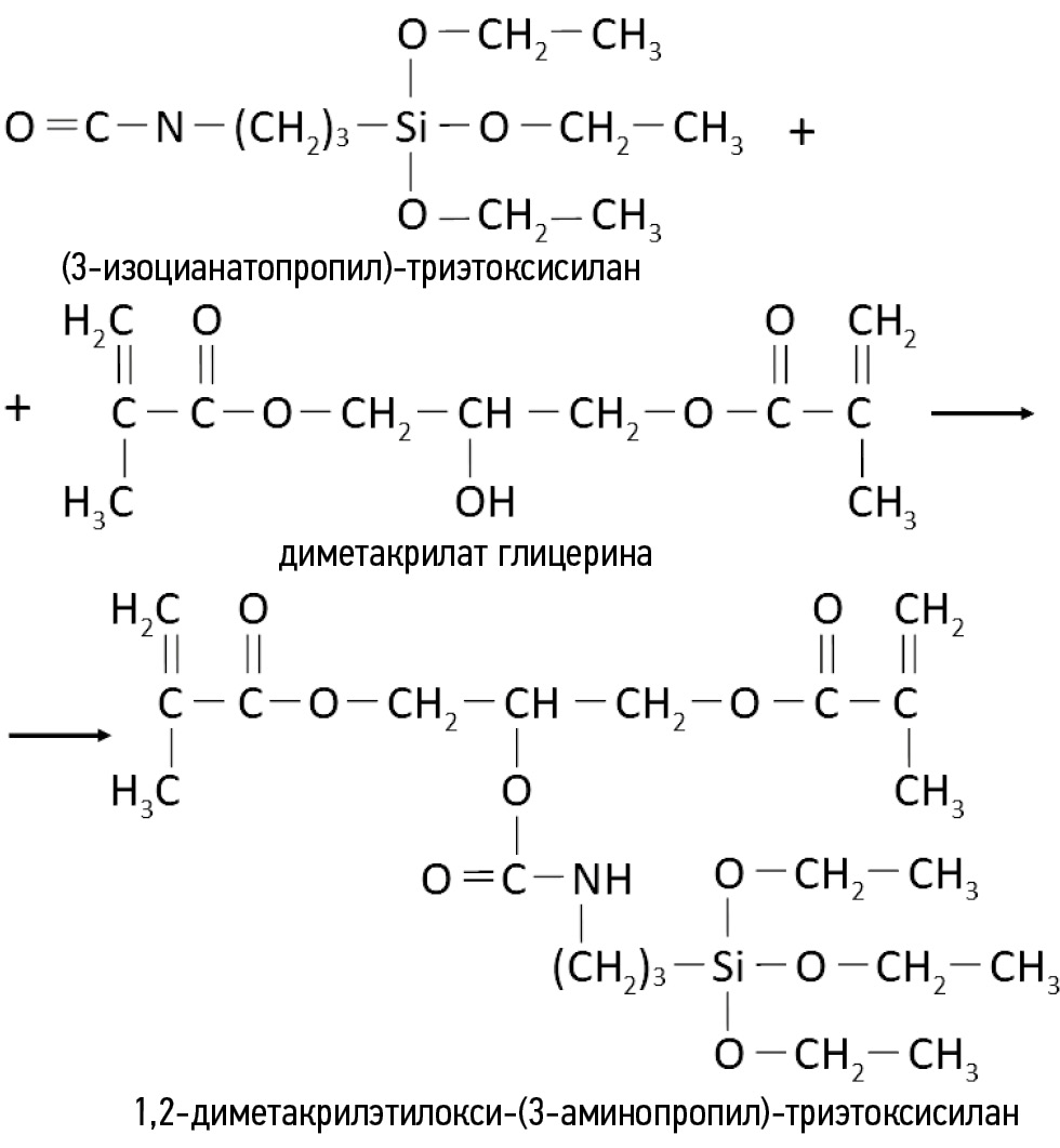 Рис. 4. Реакция (3-изоцианатопропил)-триэтоксисилан (IPTES) с диметакрилатом глицерина. / Fig. 4. Reaction between (3-isocyanatopropyl)-triethoxysilane (IPTES) and glycerol dimethacrylate.