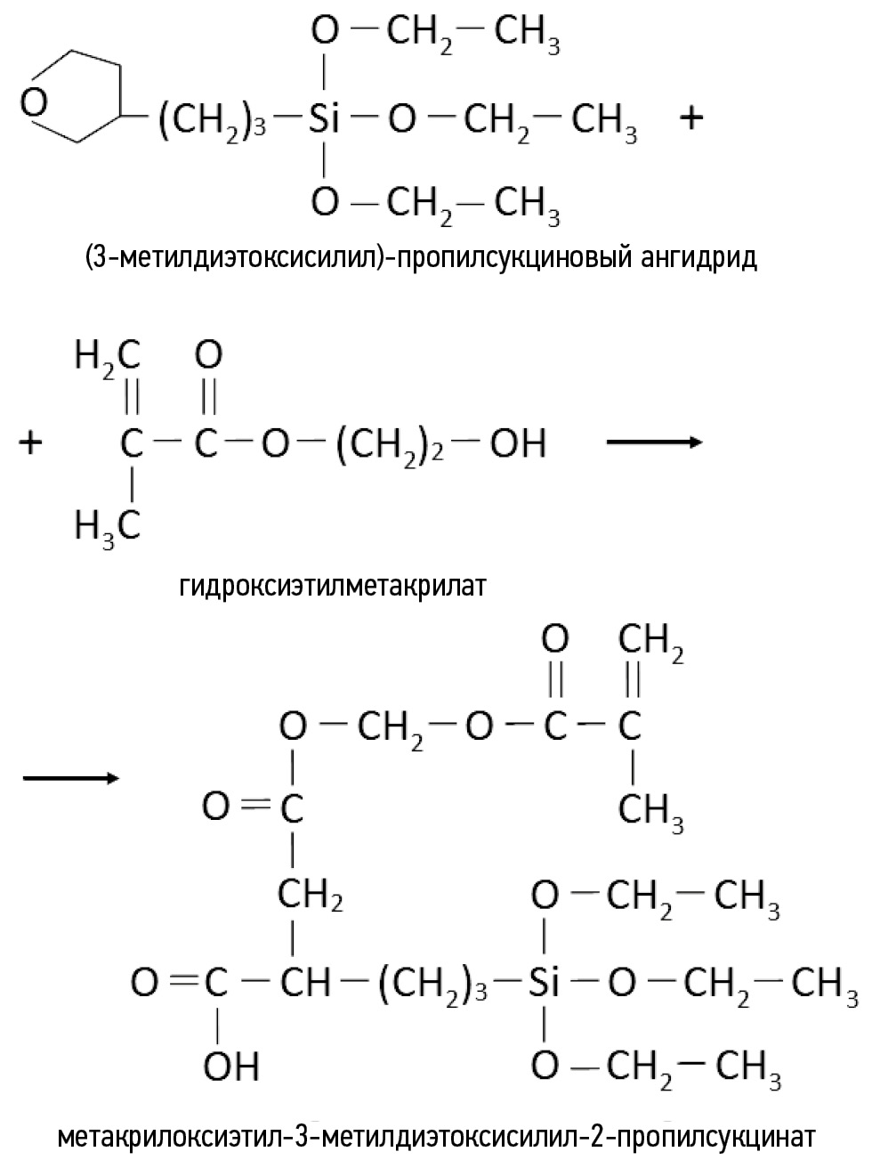 Рис. 5. Реакция гидроксиэтилметакрилата с 3-(метилдиэто-ксисилил)-пропилсукциновым ангидридом. / Fig. 5. Reaction between hydroxyethyl methacrylate and 3-(methyldiethoxysilyl)-propylsuccinic anhydride.