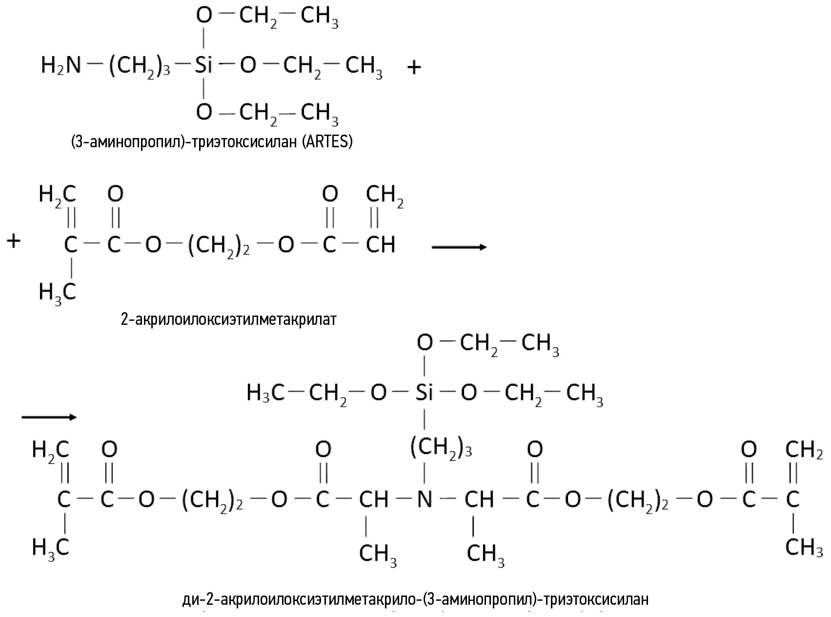 Для снижения вязкости синтезировали новые сшиваемые силаны, используя (3-аминопропил)-триэтоксисилан (APTES) [25]. С помощью реакции присоединения Михаэля APTES к 2-акрилоилоксиэтилметакрилату получали метакрилат-функционализированный аминосилан (рис. 8). Взаимодействие APTES с продуктом присоединения сукцинового ангидрида к диметакрилату глицерина приводило к образованию силана, в котором диметакрилатная группировка связывалась с конденсируемой группой через амидную группу (рис. 9).