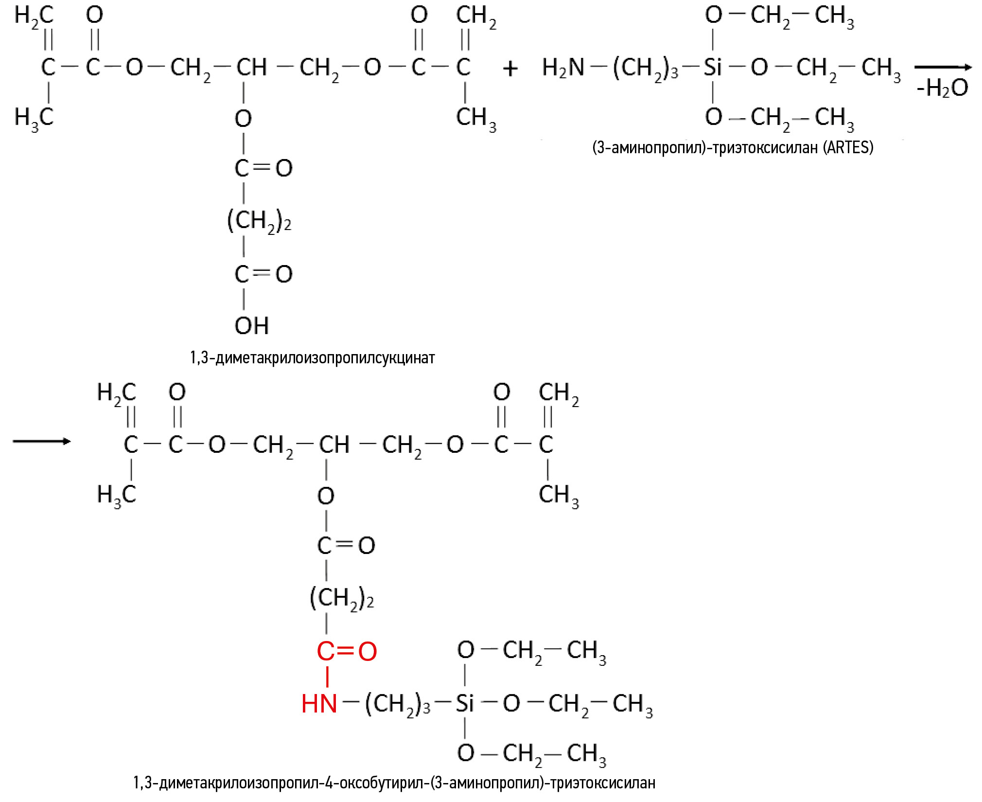 Рис. 9. Реакция 1,3-диметакрилоизопропилсукцината с APTES (красным цветом выделена амидная группа, которая, по нашему мнению, обусловливает повышение биосовместимости ормокеров с белковыми соединениями тканей зубов). / Fig. 9. Reaction of 1,3-dimethacryloisopropyl succinate with APTES (the amide group is highlighted in red, which causes an increase in the biocompatibility of ormokers with protein compounds in dental tissues).