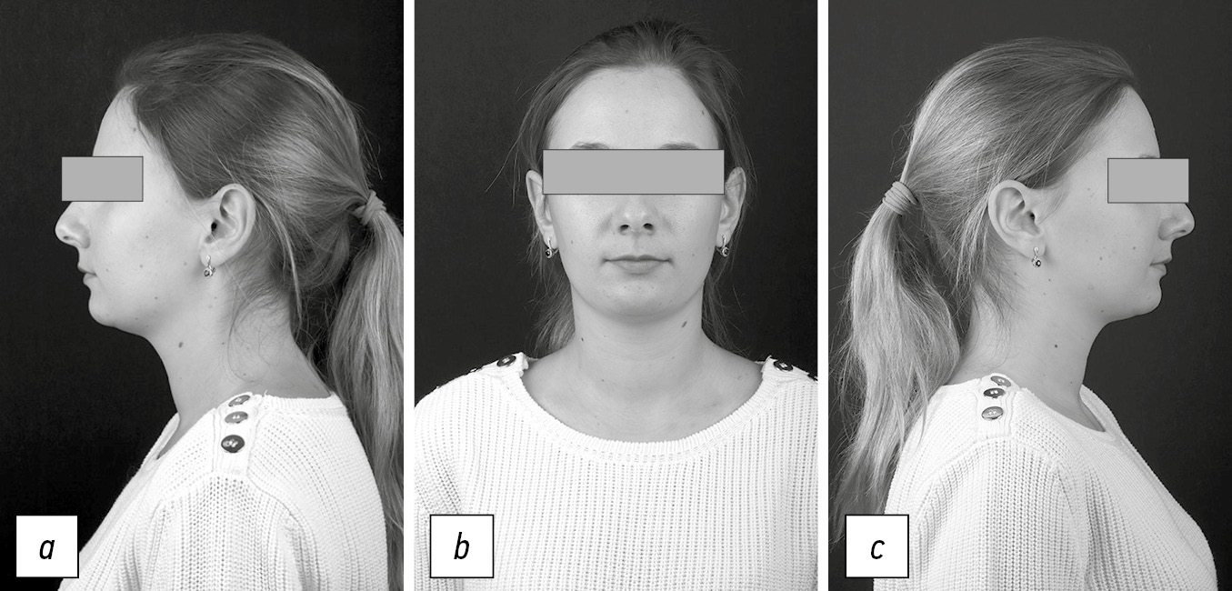 Fig. 4. Patient portrait photographs at the initial appointment: a — portrait photo 90 degrees to the right; b — full-face portrait photo; c — portrait photo 90 degrees to the left.