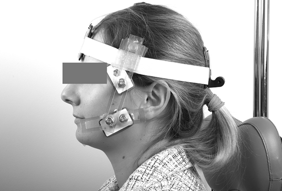 The elastic band hoop was fixed to the patient’s head (Fig. 7) and transversely connected along the parietal part of the head with another elastic band. Vertical polymer plates in the projection of the temporal and masticatory muscles were fixed to plastic bushings with clamping screws. The electrophysiological signals from the Hummingbird wireless monitoring sensor complex (Neurotech, Waukesha, WI, USA) were fixed in the slots of the vertical and horizontal plates with clamping screws, which tightly pressed them to the patient’s face with the electrodes, having installed them in the middle of the temporal and masticatory muscles previously determined by palpation. Superficial EMG of the temporal and masticatory muscles was performed. All EMGs were recorded in a sitting position without head support.