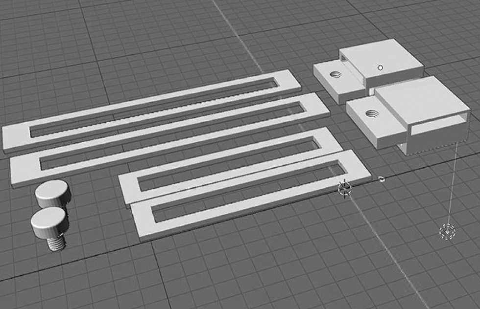 Fig. 8. Modeling of the plugs, horizontal plates, and fixing the screws in the Blender program (Blender Foundation).