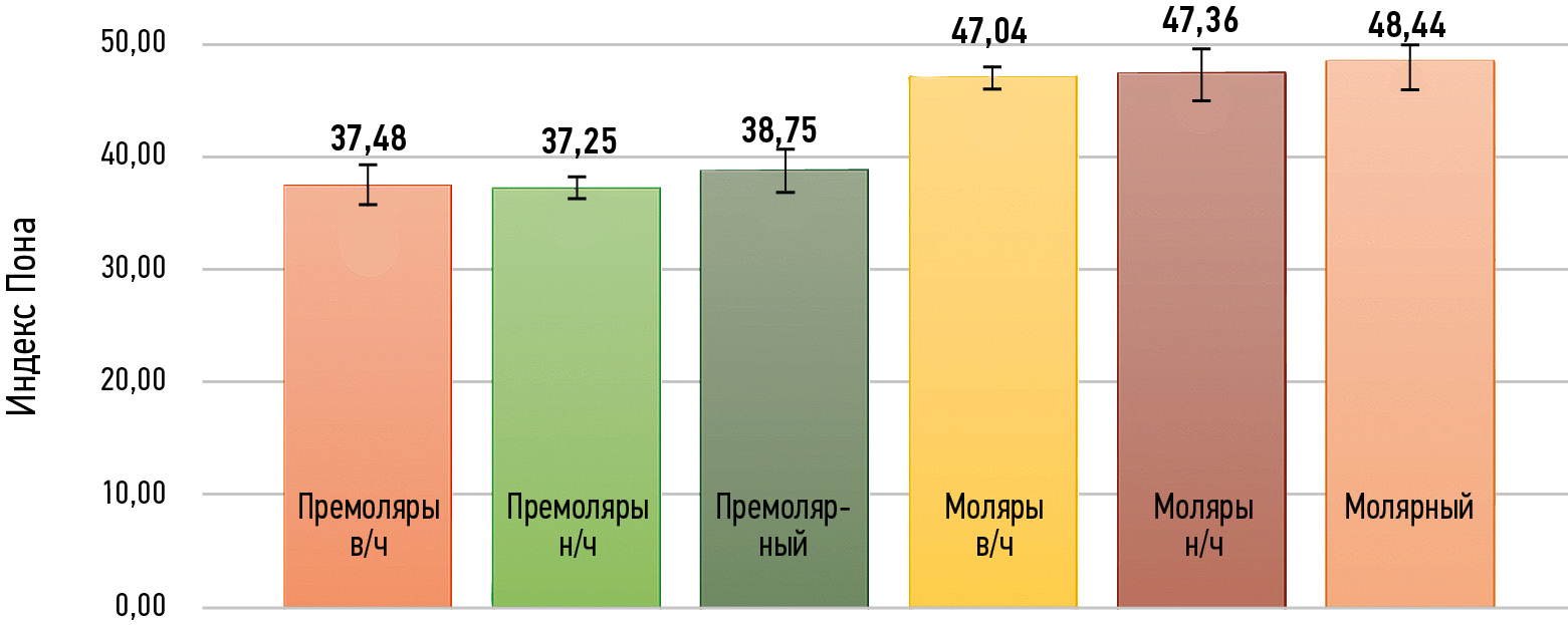 Анализ размеров и ширины зубной дуги является важным диагностическим этапом при постановке диагноза и планировании ортодонтического лечения. Расчёт индексных показателей позволяет сделать заключение о дефиците места в зубном ряду и предположить способы получения необходимого пространства в каждой конкретной клинической ситуации. Так, дополнительное пространство может быть создано за счёт удаления зубов, дистализации боковых зубов, сепарации проксимальных поверхностей зубов, а также расширения зубной дуги [1]. Расширение зубной дуги является часто используемым методом ортодонтического лечения при коррекции положения отдельных зубов и аномалий окклюзии [2]. Стабильность расширения зубной дуги в трансверсальной плоскости всегда вызывала споры [3, 4]. Несмотря на то, что зубная дуга соответствует законам геометрии, её форма и ширина индивидуальна для каждого пациента [5, 6]. По этим причинам [7] в 1909 году был предложен индекс Пона в качестве метода при прогнозировании идеальной ширины дуги, необходимой для уменьшения скученности зубов и получения более стабильных конечных результатов. А. Пон обнаружил, что существует постоянная взаимосвязь между отношением суммы мезио-дистальных размеров четырёх верхних резцов и трансверсальных размеров зубного ряда. Он предположил, что отношение в идеале должно составлять 0,8 в области первых премоляров и 0,64 в области первых моляров [8]. Немецкие учёные Линдер и Харт (1939) предложили коэффициенты 0,85 и 0,65 соответственно [9]. Некоторые исследования показывают, что данные индексы до сих пор являются надёжным инструментом для прогнозирования ширины зубной дуги [10, 11], в то время как другие исследователи утверждают обратное [12, 13]. Настоящая работа была инициирована для оценки применимости индекса Пона при планировании ортодонтического лечения у жителей Санкт-Петербурга и Ленинградской области.