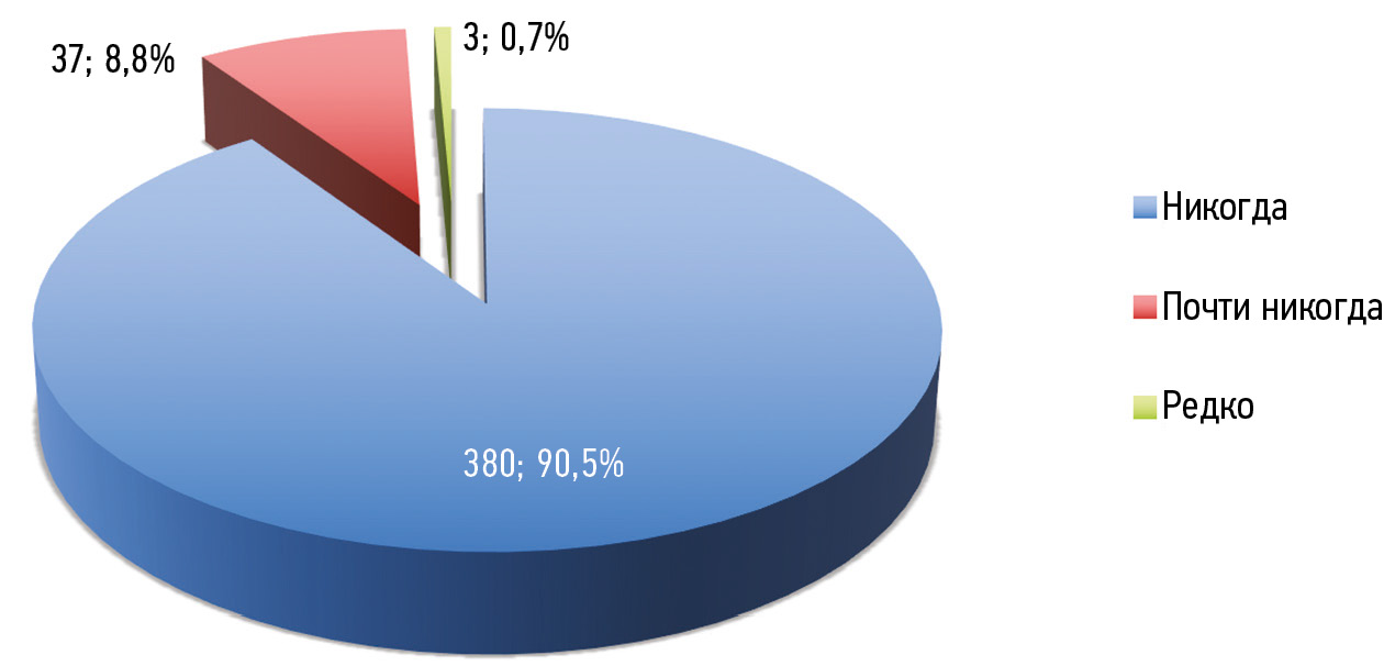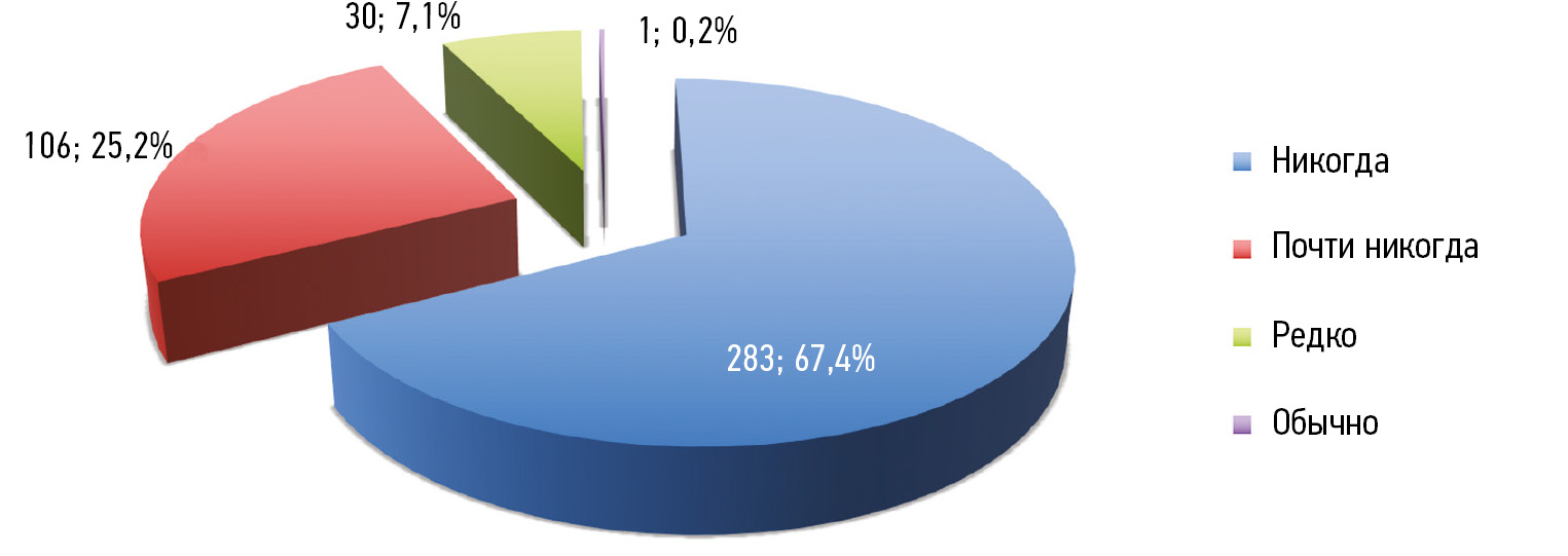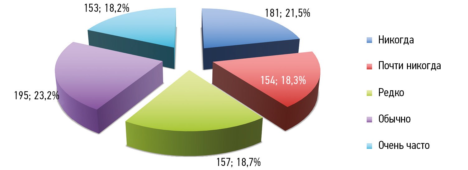 Как видно из табл. 1, а также из диаграммы, демонстрирующей соотношение тех или иных ответов (рис. 8), все пациенты в той или иной степени испытывают неудобства, связанные с проблемами в полости рта.
