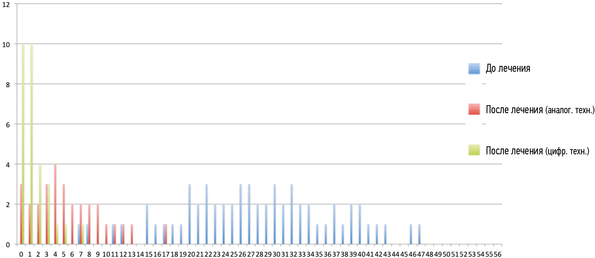Рис. 11. Гистограмма, соотносящая суммы набранных баллов после проведённых опросов при помощи OHIP-14 до и после лечения (горизонтальная ось) и количество респондентов (вертикальная ось), набравших определённую сумму баллов.
