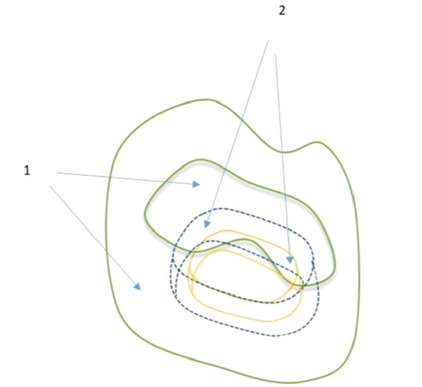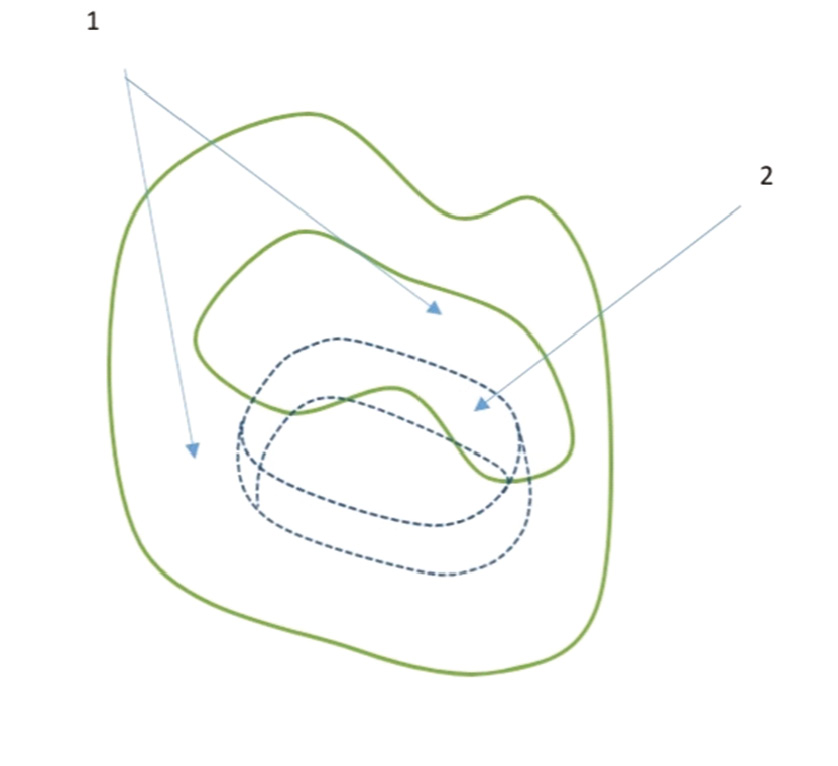 Рис. 4. Конденсация нити с композитом в два слоя (1 — стенки зуба; 2 — нить с композитом).