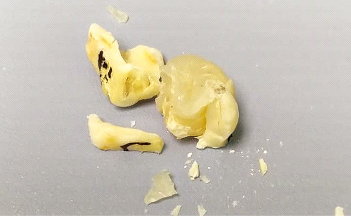 Отличительной особенностью, выявленной в ходе эксперимента на разрывной машине, является то, что у зубов 2-й группы максимальной деформацией являлся скол коронки зуба (рис. 5), в то время как зубы 1-й группы под воздействием силы разрушились на несколько мелких частей (рис. 6).