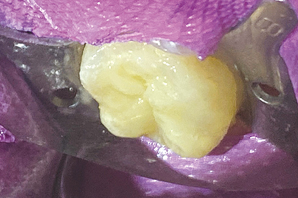Проведено лечение: наложение изоляционной системы, под мандибулярной анестезией раствором артикаина 1 мл и водо-воздушным охлаждением удалена временная реставрация зуба 2.7, поверхность препарирована для изготовления прямой композитной реставрации. Проведено селективное протравливание эмали и нанесение адгезивной системы 7-го поколения Uni Bond Universal (IDS)1 (рис. 12), далее проведено армирование стенок зуба «Гусеницей» методом циркулярной конденсации нити по всему периметру полости (рис. 13). Дальнейшая прямая реставрация проведена наногибридным универсальным композитом Boston, который входит в состав «Гусеницы». Материал имеет повышенную механическую прочность для пломбирования жевательной группы зубов (рис. 14).