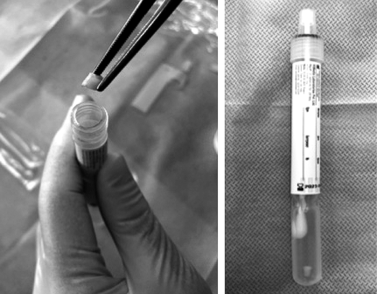 Рис. 3. Аутогенный дентинный блок, помещённый в транспортную систему с нейтрализующей средой Ди-Ингли (HiMedia, Индия).