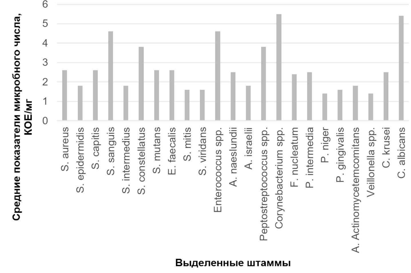 Изучение микробного фона исследуемых аутогенных дентинных блоков из контрольной группы (без проведения обработки) показало полимикробный характер их контаминации в 57–79% случаев. Микрофлора была представлена преимущественно ассоциациями облигатных и факультативных анаэробов, а также некоторыми представителями аэробной группы. Анаэробно-аэробные ассоциации состояли чаще из представителей нескольких видов бактерий. В бактериальных ассоциациях, выделенных из исследуемых образцов в количестве >2 lg КОЕ/мг, определялись Staphylococcus aureus, S. capitis, Streptococcus mutans, Enterococcus spp., E. faecalis, Actinomyces naeslundii, A. israelii, Aggregatibacter actinomycetemcomitans, а доминирующими по количественному показателю содержания в исследуемом материале были преимущественно микроаэрофильные стрептококки Streptococcus sanguis, S. constellatus, Actinomyces spp., Corynebacterium spp. и облигатные неспорообразующие анаэробные микроорганизмы Peptostreptococcus anaerobius, Fusobacterium spp., Prevotella intermedia, Porphyromonas gingivalis в количестве до 3–5,5 lg КОЕ/мг. Была значительной и доля дрожжевых грибов Candida spp. (2,7–5,5 lg КОЕ/мг). Низковирулентные, комменсальные, а также виды, несвойственные микрофлоре полости рта, встречались в единичных случаях (рис. 4).