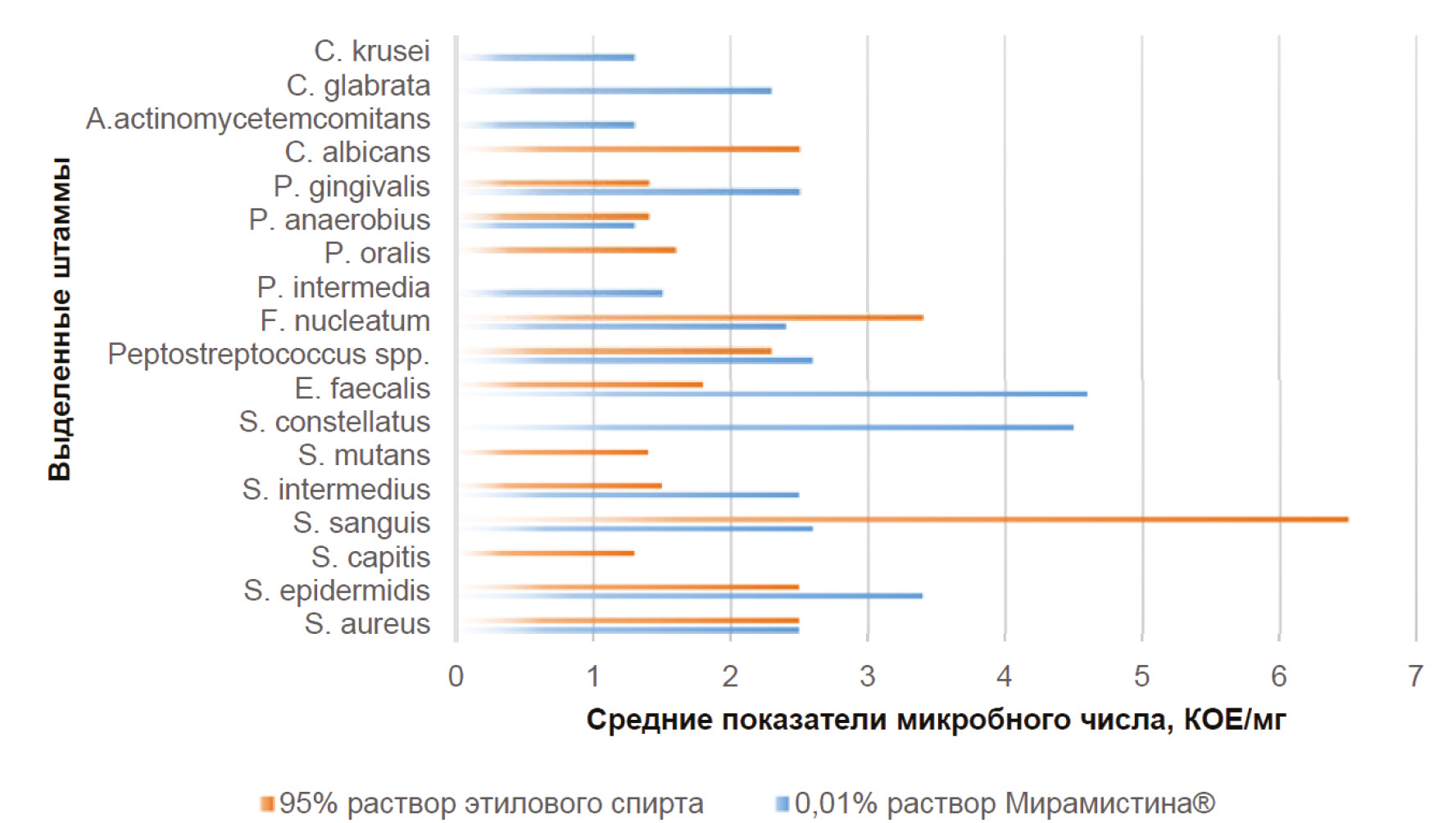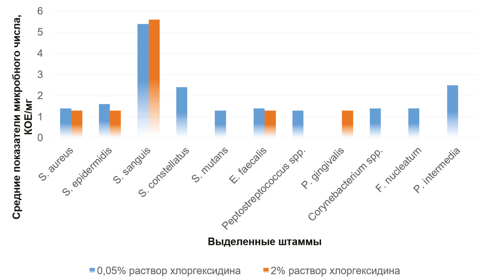 В нашей работе при анализе исследуемых групп установлено, что при применении 0,01% раствора Мирамистина® и 95% раствора этилового спирта, а также 95% раствора этилового спирта и 0,05% раствора хлоргексидина не наблюдалось достоверной разницы (p >0,05). Однако 2% раствор хлоргексидина в качестве антисептика продемонстрировал наилучшие показатели по снижению количества высеваемых микроорганизмов (p <0,05). Практически для всех выделенных видов количество жизнеспособных микробных клеток было ниже (рис. 7).