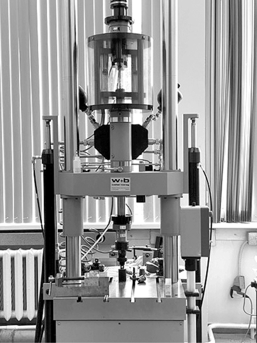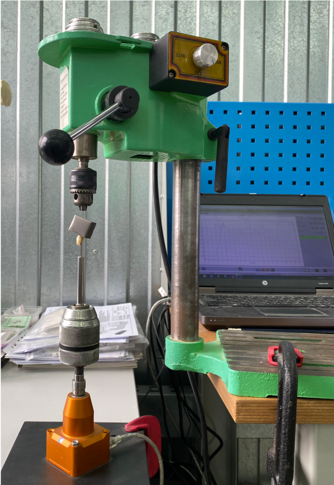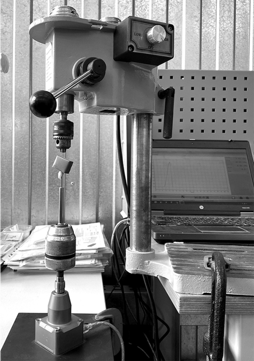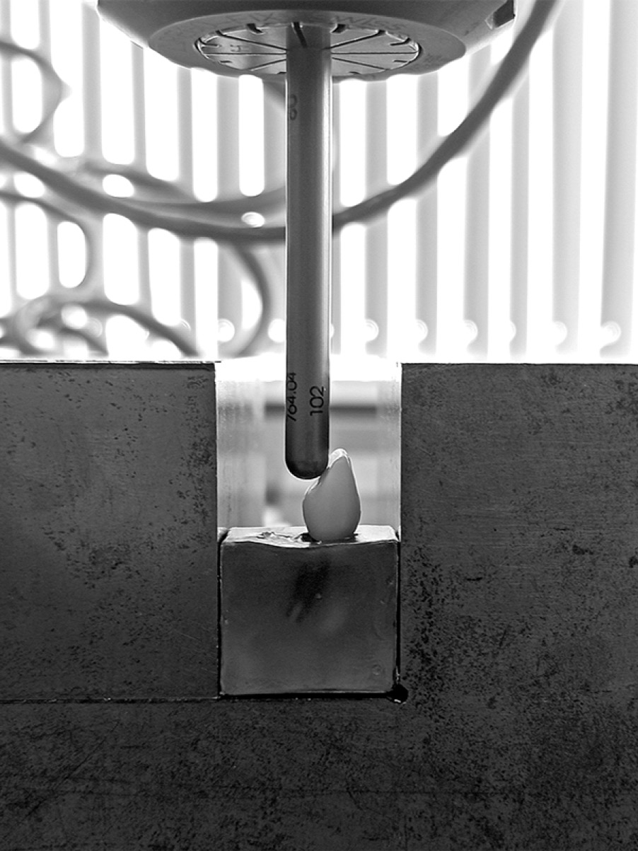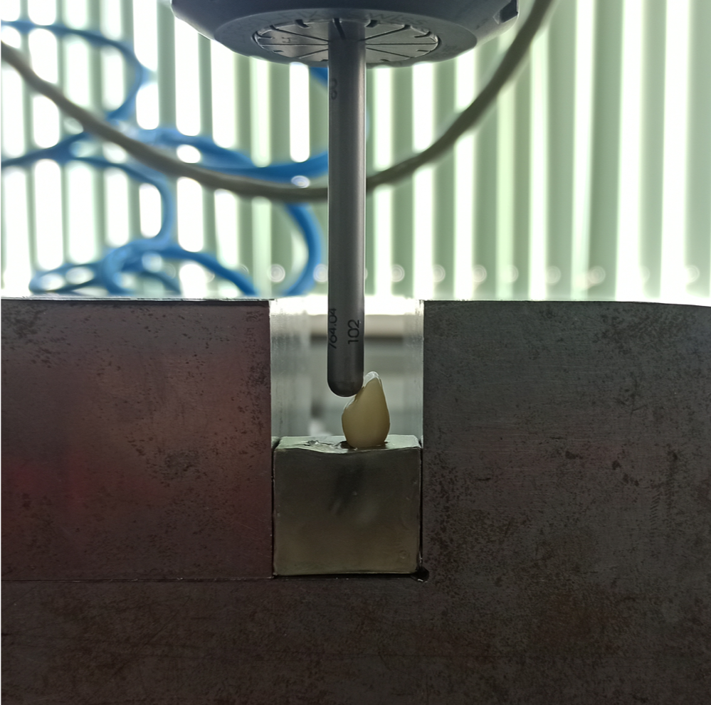 Модель фиксировалась в тисках, установленных на рабочем столе универсальной динамической испытательной машины WalterBay AG LFV 10-50T (Швейцария) таким образом, чтобы нагружающий элемент (титановая балка диаметром 5,5 мм с полусферой на конце) касался лингвальной поверхности коронки (рис. 6, 7).