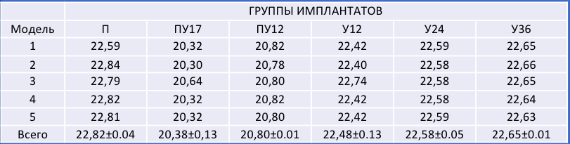 При визуальном осмотре каких-либо повреждений или нарушения целостности коронки, а также ослабления степени затяжки фиксирующего винта обнаружено не было. Минимальные значения максимального крутящего момента были определены у группы «ПУ17» и составили 20,804±0,01 Н/см, максимальные значения — у группы «П»: 22,82±0,04 Н/см, при этом значительной статистической разницы в значениях между группой «П» и группами «У12, «У24», «У36» определено не было. Однако значения у групп «П», «У12, «У24», «У36» были выше в сравнении с группами с угловыми абатментами «ПУ12» и «ПУ17».