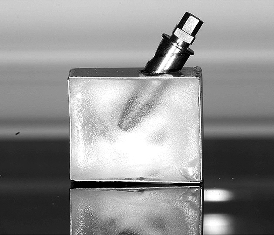 Рис. 1. Имплантат, фиксированный в стальной цилиндр, заполненный акриловой пластмассой.