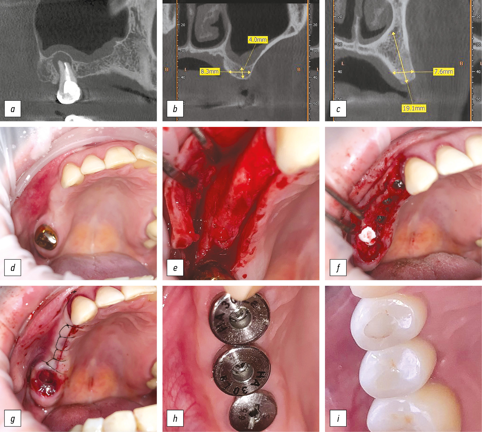 Fig. 1. Stages of dental rehabilitation of patient L., 37-years-old: a, b, c — sections of a computed tomogram in the area of missing teeth; d — the initial clinical picture in the oral cavity; e, f, g — the stages of installing dental implants in the area of missing teeth; h — installation of gingival cuff shapers; i — fixing the final orthopedic restoration.