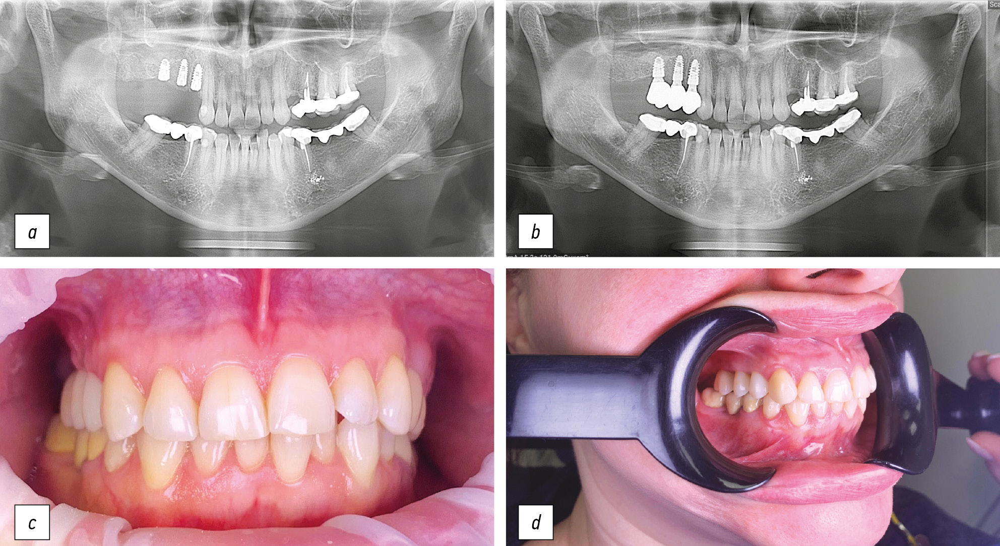 Рис. 2. Этапы стоматологической реабилитации пациентки Л., 37 лет: а — фрагмент ортопантомограммы перед установкой формирователей десневой манжеты; b — фрагмент ортопантомограммы через год после установки постоянной ортопедической конструкции; c — вид полости рта после фиксации окончательной ортопедической конструкции; d — контрольный осмотр пациента через 1,5 года после завершения стоматологической реабилитации.