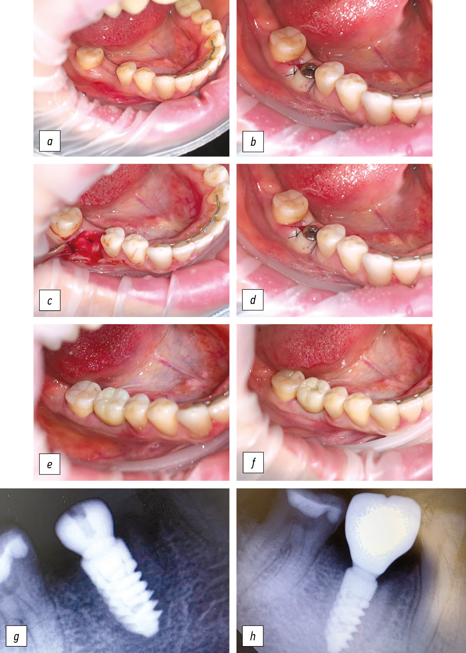 Рис. 3. Этапы стоматологической реабилитации пациента М., 35 лет: а — исходная клиническая картина; b, c, d — выполнена установка дентального имплантата с фиксацией формирователя десневой манжеты и коррекцией профиля мягких тканей; e — этап фиксации окончательной ортопедической конструкции; f — контрольный осмотр через 1 год; g, h — контрольные прицельные снимки на этапах стоматологической реабилитации.