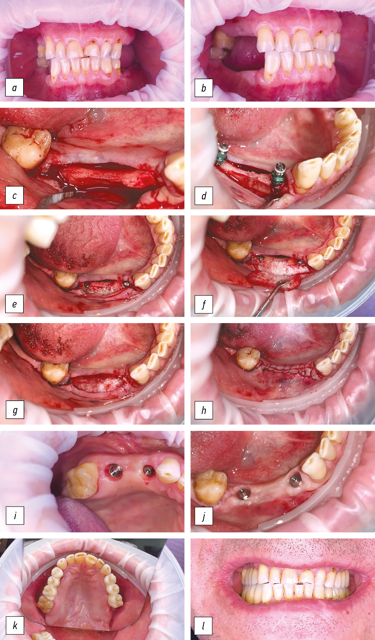 Рис. 4. Этапы стоматологической реабилитации пациента Ю., 58 лет: а, b — исходная клиническая картина; c, d, e, f, g, h — этапы проведения направленной костной регенерации с целью увеличения объёма костной ткани нижней челюсти по ширине одновременно с установкой дентальных имплантатов; i, j — вид стабильных мягких тканей в области мультиюнит-абатментов перед этапом протезирования; k, l — фиксация постоянных ортопедических конструкций из диоксида циркония, завершение первого этапа стоматологической реабилитации.