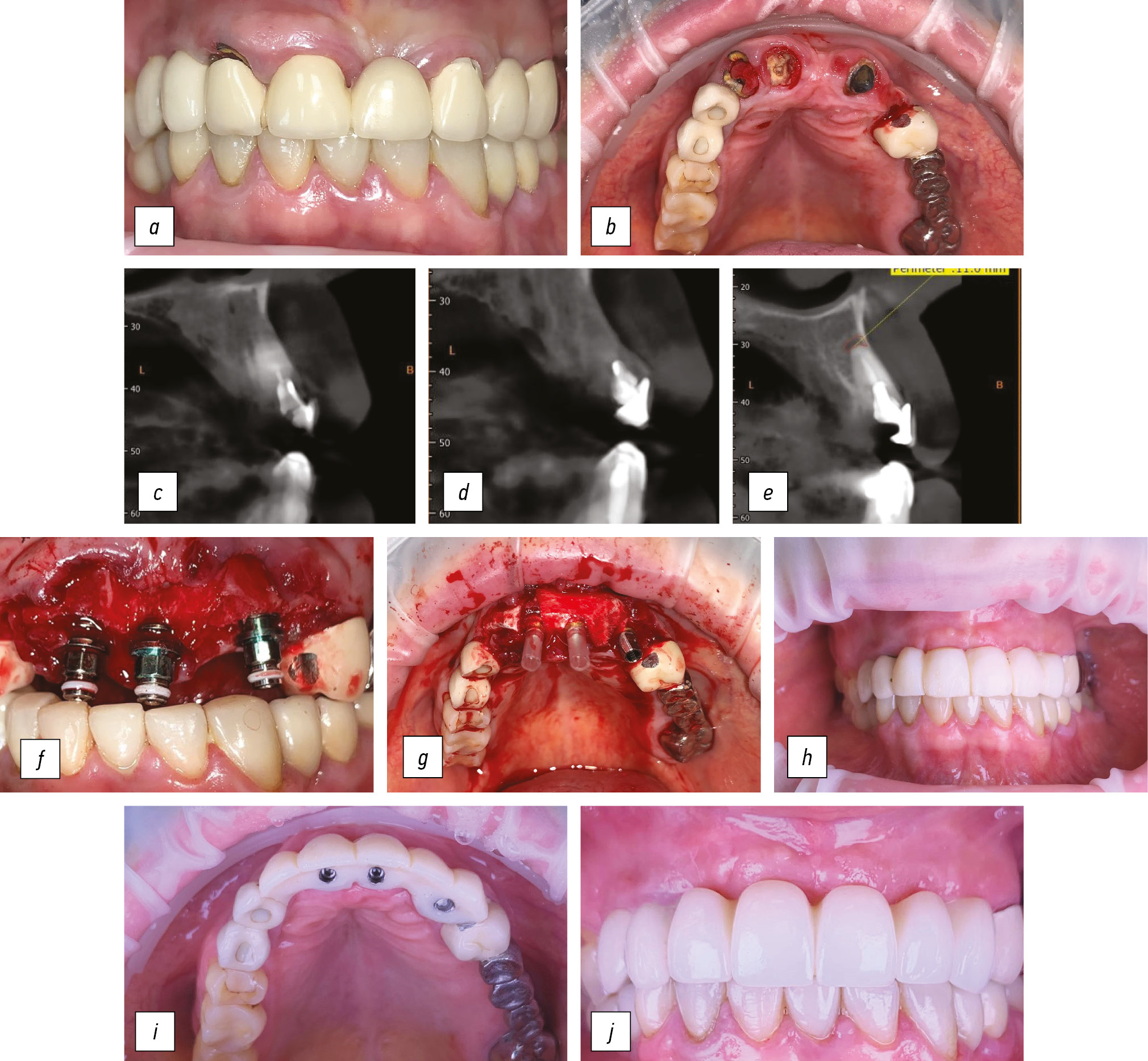 Рис. 5. Этапы стоматологической реабилитации пациентки Ж., 56 лет: а, b — исходная клиническая картина; c, d, e — срезы компьютерной томограммы фронтальной группы зубов на верхней челюсти; f, g — этапы хирургического лечения; h, i — установка временной ортопедической конструкции с немедленной нагрузкой; j — фиксация постоянных коронок из диоксида циркония.
