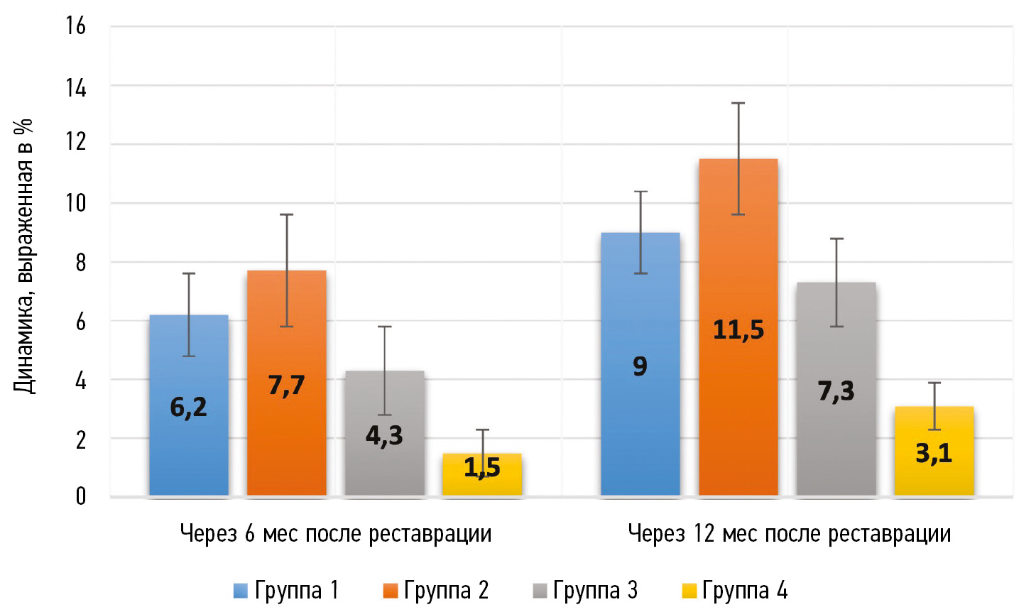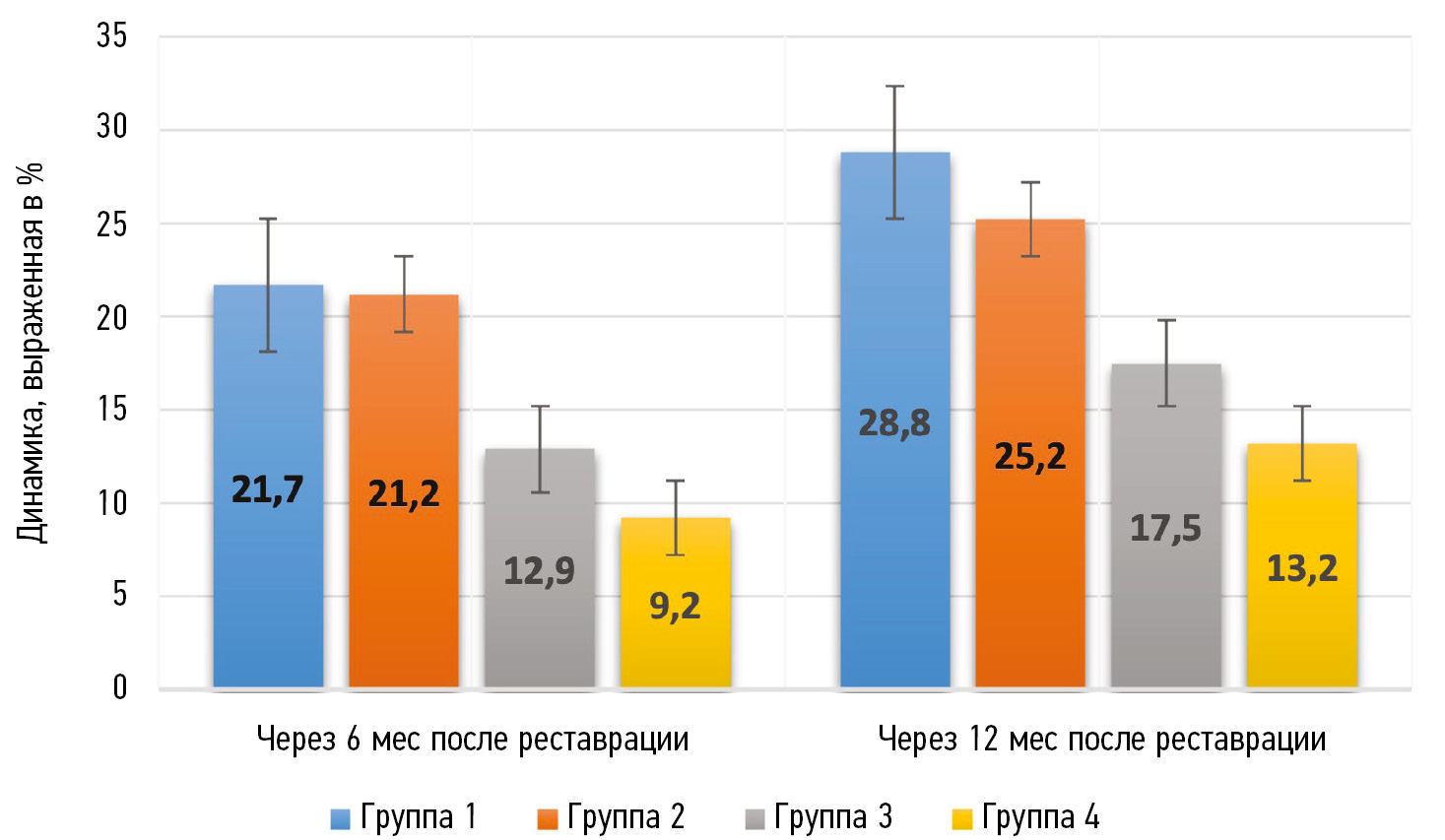 Наименьшая положительная динамика показателей качества жизни респондентов в связи с их стоматологическим статусом отмечена у пациентов группы 4, при лечении которых использовали базовый адгезивный протокол (согласно инструкции компании-производителя), текучий композит не применяли, реставрацию выполняли из универсального светоотверждаемого композитного материала, не проводили устранение функциональной перегрузки зубов. Показатель качества жизни у пациентов данной группы снизился на 3,1% (рис. 2, 3).