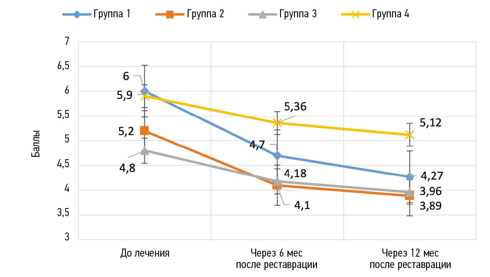 Оценка динамики показателей качества жизни 128 пациентов групп 1–4 после лечения показала, что через 6 мес у этих пациентов было выявлено достоверное среднее снижение интегрального показателя OHIP-14 на 4,9%, через 12 мес — на 7,7%. Выраженная динамика показателей качества жизни пациентов с абфракционными дефектами групп 1–4 отмечена по интегральной шкале «физическая боль», где через 12 мес после лечения среднее значение OHIP-14 снизилось на 21,2% по сравнению с исходными значениями. Сходная динамика (снижение баллов) зафиксирована по шкале «физические ограничения».