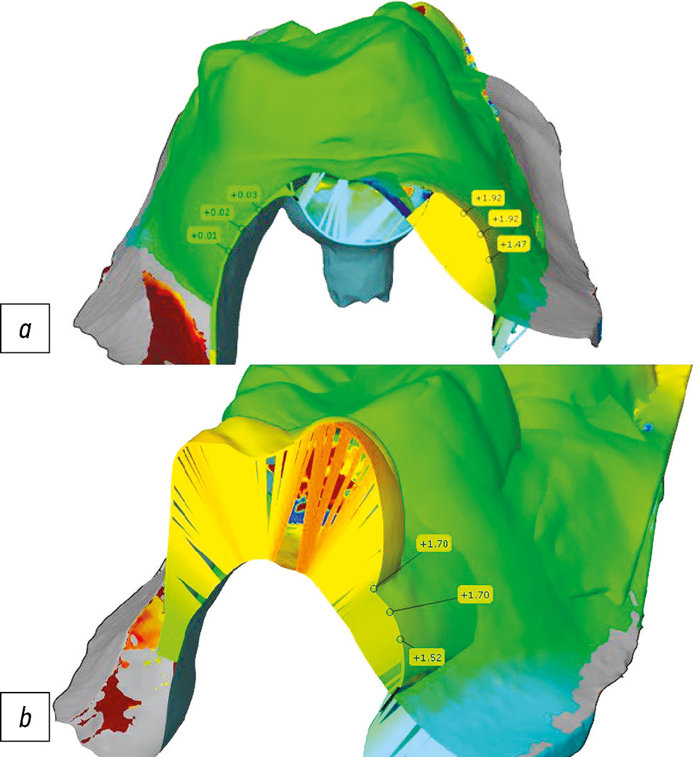 Оценку исходной толщины мягких тканей в интересующей области проводили путём сопоставления dcm-файлов, полученных после конусно-лучевой компьютерной томографии, и stl-файлов, полученных в результате внутриорального сканирования, в программном обеспечении 3Diagnosys (3DIEMME, Италия) по заранее определённым контрольным точкам. Оценку прироста (изменения) толщины мягких тканей проводили при помощи сопоставления цифровых моделей на этапах лечения в инженерной программе GOM Inspect (GOM GmbH, Braunschweig, Германия). Для этого определяли равноудалённые контрольные точки от вершины альвеолярного гребня в апикальном направлении по центру установленного имплантата, вычисляли среднее значение по всем точкам.