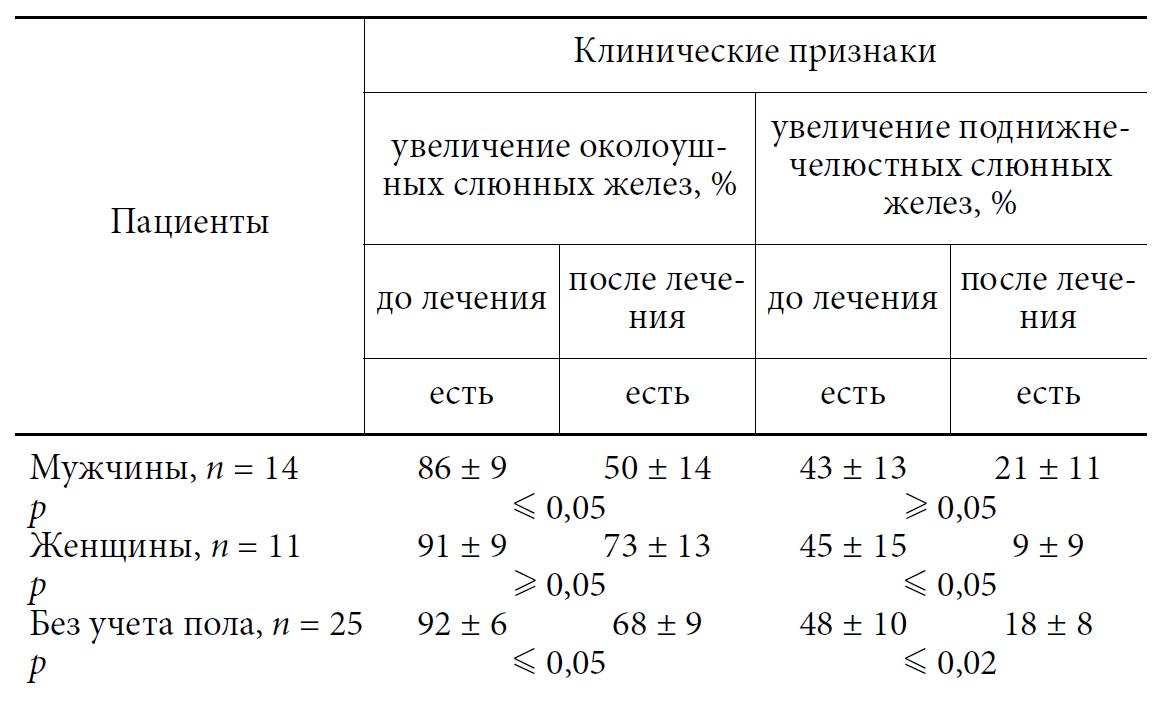 При осмотре у большинства (92%) больных 2-й группы без учета пола до лечения обнаружено достоверное увеличение околоушных СЖ; у 12 (48%) отмечено увеличение поднижнечелюстных СЖ. Такую же тенденцию наблюдали у больных в зависимости от пола (см. табл. 3). После комплексного лечения констатировали достоверное уменьшение околоушных у мужчин и поднижнечелюстных СЖ у женщин (р m 0,05).