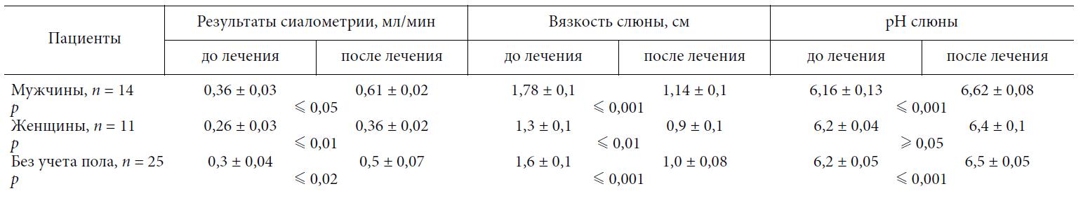 После лечения вязкость достоверно (р m 0,001) снижалась, однако не достигала нормальных величин как у мужчин, так и у женщин. Также была снижена pH смешанной слюны, однако после лечения она незначительно, но достоверно (р m 0,001) повышалась, что свидетельствовало в пользу эффективности проводимой терапии: 6,16 ± 0,13 и 6,62 ± 0,08 у мужчин; 6,2 ± 0,04 и 6,4 ± 0,1 у женщин, в среднем 6,2 ± 0,05 и 6,5 ± 0,05 до и после комплексного лечения.