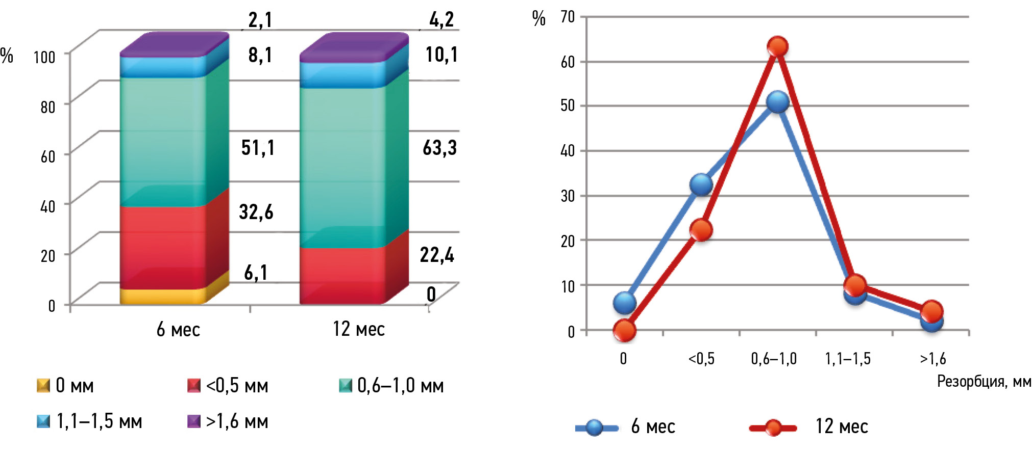 К 12 мес после дентальной имплантации наиболее часто встречалась умеренно выраженная (31 случай — 63,3%) вертикальная резорбция альвеолярной костной ткани вокруг шейки имплантата за счёт снижения количества имплантатов с начальными признаками вертикальной резорбции — с 32,6 до 22,4%. В целом на долю трёх степеней вертикальной резорбции альвеолярной костной ткани вокруг шейки имплантата (начальной, умеренно выраженной и выраженной) приходится 95,8% наблюдений. При этом медиана распределения приходится на умеренно выраженную степень резорбции. Резко выраженная вертикальная резорбция костной ткани наблюдалась вокруг шейки двух имплантатов (4,2%).