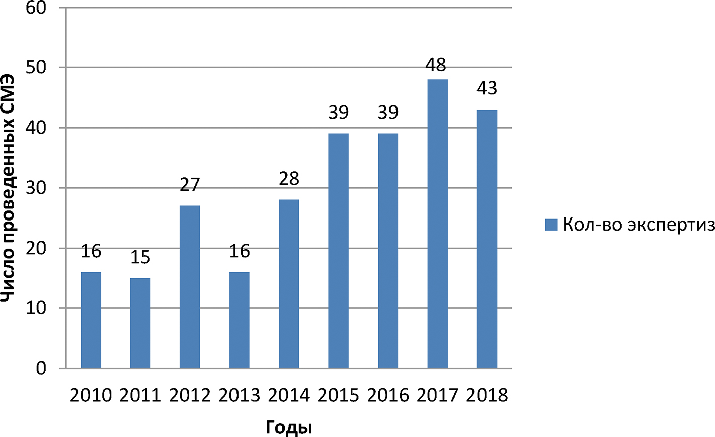 Рис. 1. Количество стоматологических экспертиз, проведенных в 2010–2018 гг. в г. Санкт-Петербурге. СМЭ — судебно-медицинские экспертизы.