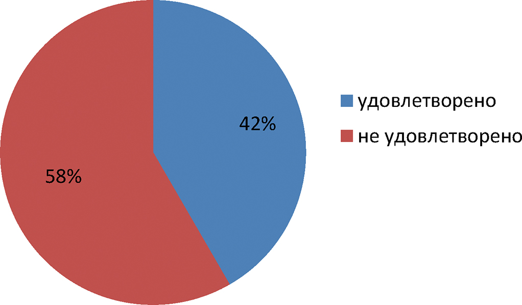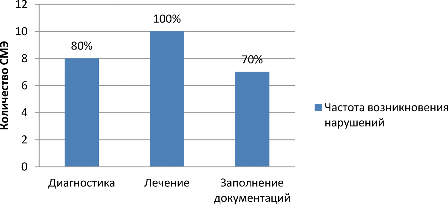 Экспертная комиссия из 24 СМЭ по ортодонтическому лечению в 42% случаев выявила следующие нарушения: неудовлетворительное качество проведенной диагностики (80%), эффективность лечения (100%), нарушения в заполнения документации (70%). В оставшихся 58% экспертиз дефектов оказания ортодонтического лечения экспертной комиссией не установлено (рис. 6, 7).