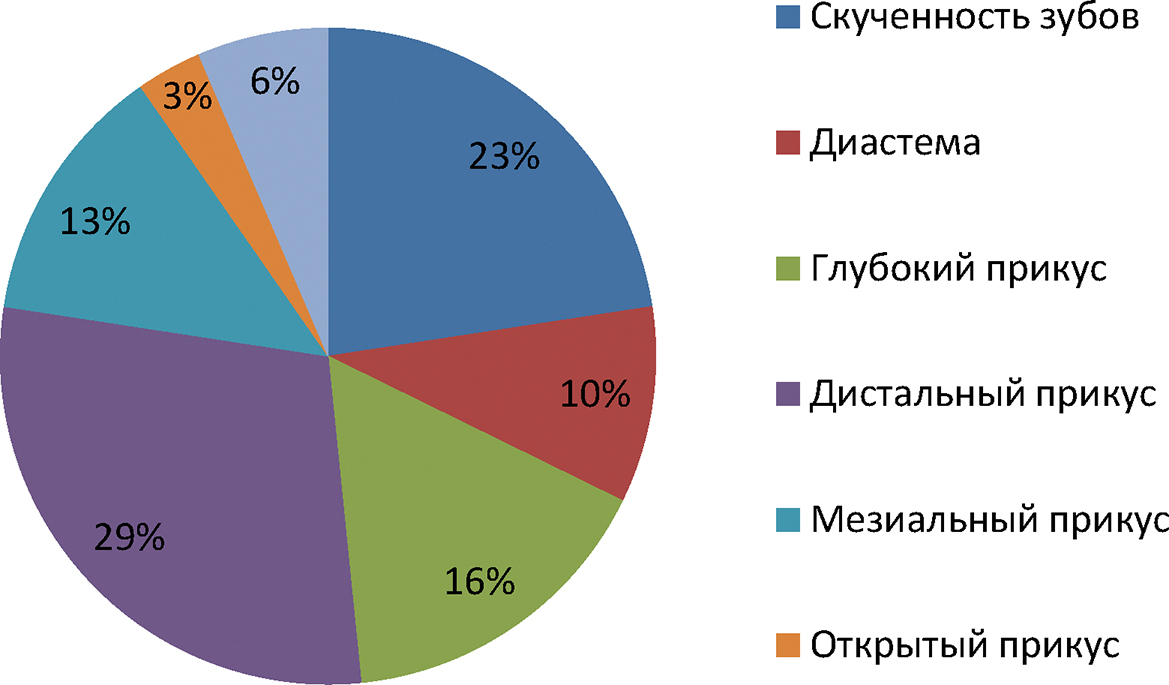 По данным документации, предоставленной для СМЭ, наиболее часто встречаются диагнозы по классификации МКБ-10 у пациентов перед началом ортодонтического лечения с аномалиями соотношения зубных дуг К07.2 (61%), аномалиями положения зубов К07.3 (32%), болезни височно-нижнечелюстного сустава (ВНЧС) К07.6 (7%). Среди данных диагнозов на первом месте по частоте встречаемости дистальный прикус (29%), на втором — скученность зубов (23%), на третьем — глубокий прикус (16%). Также в структуре диагнозов встречаются мезиальный прикус (13%), диастема (10%), синдром болевой дисфункции ВНЧС (6%), а также открытый прикус (3%) (рис. 8, 9).