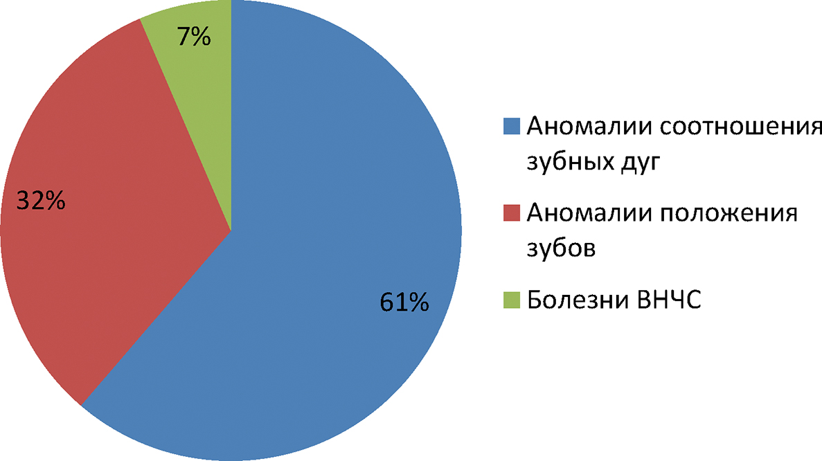 - В структуре клинических диагнозов пациентов, до начала ортодонтического лечения преобладали аномалии соотношения зубных дуг (61%), аномалии положения зубов (32%). Наиболее распространенные ЗЧА: дистальный прикус (29%), скученность зубов (23%), глубокий прикус (16%).